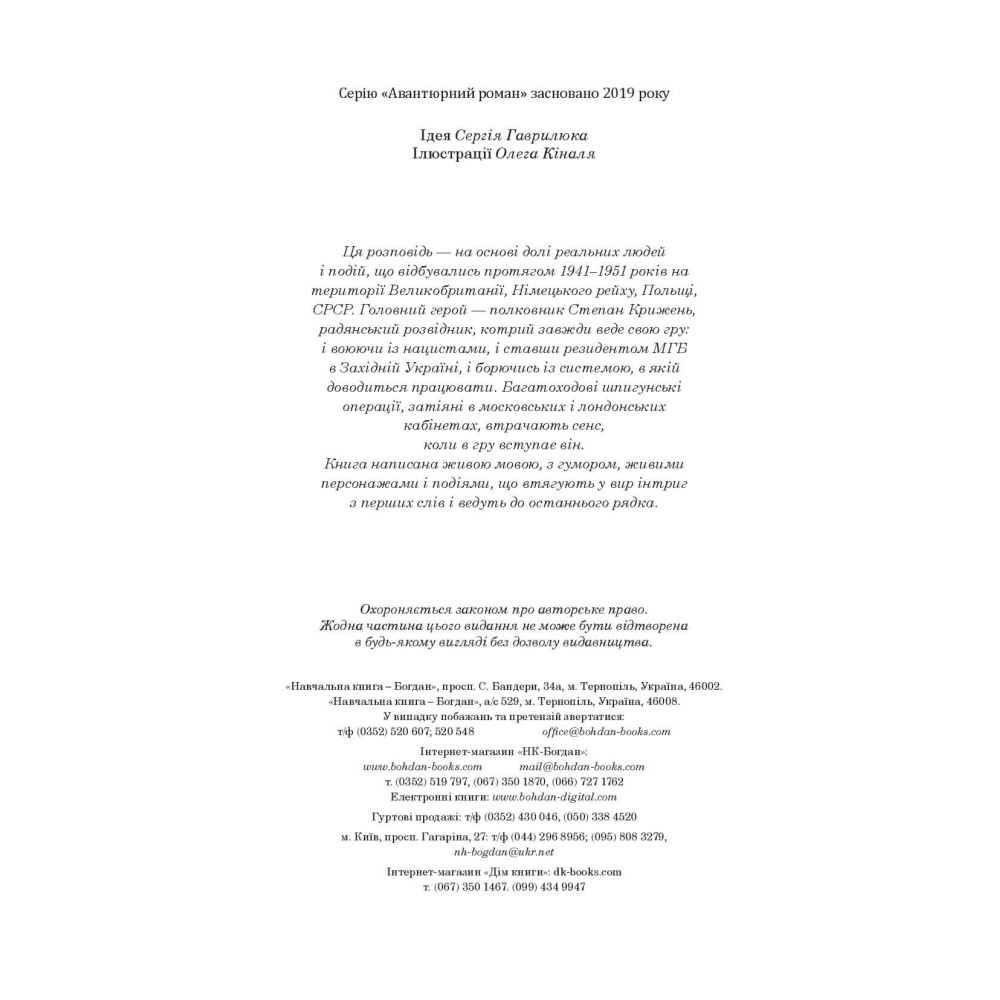 Ця розповідь — на основі долі реальних людей і подій, що відбувались протягом 1941–1951 років на території Великобританії, Німецького рейху, Польщі, СРСР. Головний герой — полковник Степан Крижень, радянський розвідник, котрий завжди веде свою гру: і воюючи із нацистами, і ставши резидентом МГБ в Західній Україні, і борючись із системою, в якій доводиться працювати. Багатоходові шпигунські операції, затіяні в московських і лондонських кабінетах, втрачають сенс, коли в гру вступає він. Книга написана живою мовою, з гумором, живими персонажами і подіями, що втягують у вир інтриг з перших слів і ведуть до останнього рядка.