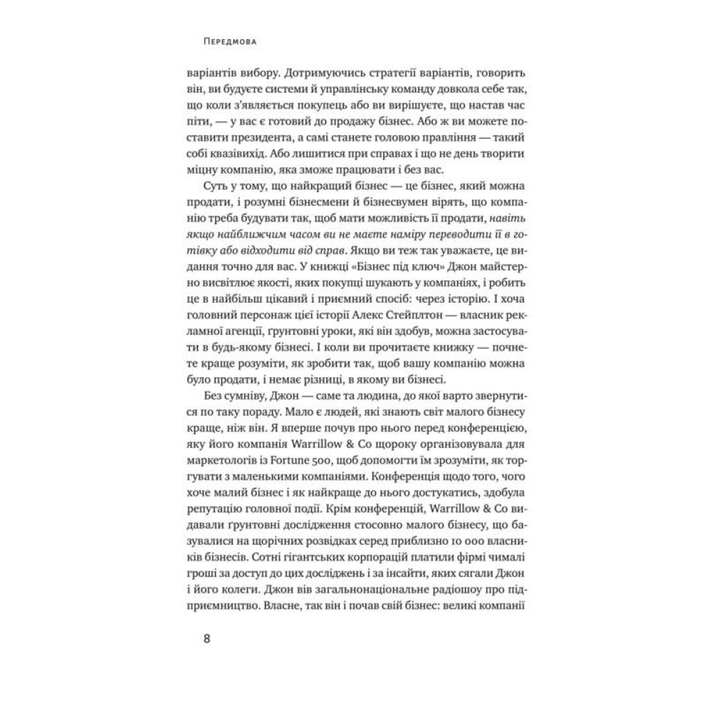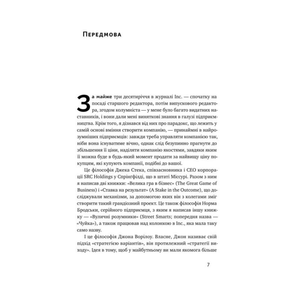 Амбітному підприємцю складно уявити, що колись у нього виникне бажання залишити компанію, яку він створював, докладаючи титанічних зусиль. Він готовий приділяти сто відсотків свого часу та сил, і йому чи їй здається, що так буде завжди. Однак, як стверджує автор цієї книжки, існує розумніша стратегія — створити проект, який успішно функціонуватиме без вас.ДЛЯ КОГО КНИЖКАДля керівників та власників бізнесів, людей, які цікавляться підприємництвом чи планують розвивати власну справу.ЧОМУ ЦЯ КНИЖКААвтор пропонує захопливу історію, яка навчить вас, як управляти компанією так, ніби вона існуватиме вічно, при цьому наділяти її новими якостями, безупинно збільшувати її ціну та котрий ви зможете вигідно продати в будь-який момент.ПРО АВТОРАДжон Ворілоу — підприємець, письменник. Засновник компанії Value Builder System, яка допомагає бізнесам збільшити їхню вартість, та автор однойменної методики. Визнаний одним із найвпливовіших B2B-маркетологів за версією американського ділового журналу Who's Who.