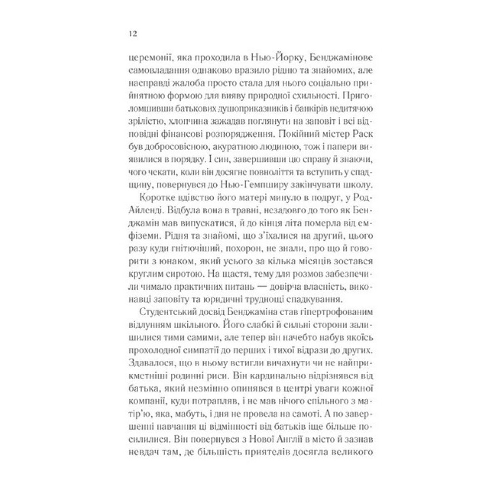 Бенджамін і Гелен Раски немов створені одне для одного. Ексцентричні напіввідлюдники, що мають статус небожителів і небачені статки. Він — орудар на фінансовому ринку, вона займається доброчинністю. Аж раптом у Гелен зроджується тривожність, проростаючи безладними монологами. Чи Бенджамін слухатиме? Чи зможе витягти дружину з мороку божевілля? Про смерть героїні з перших сторінок роману «Зобов’язання» такого собі Гарольда Веннера свого часу дізнався мало не весь Нью-Йорк.