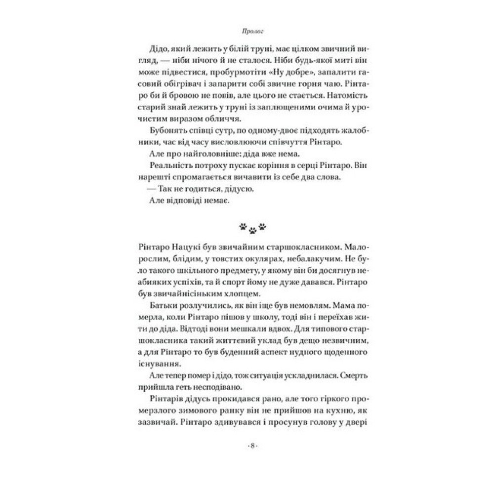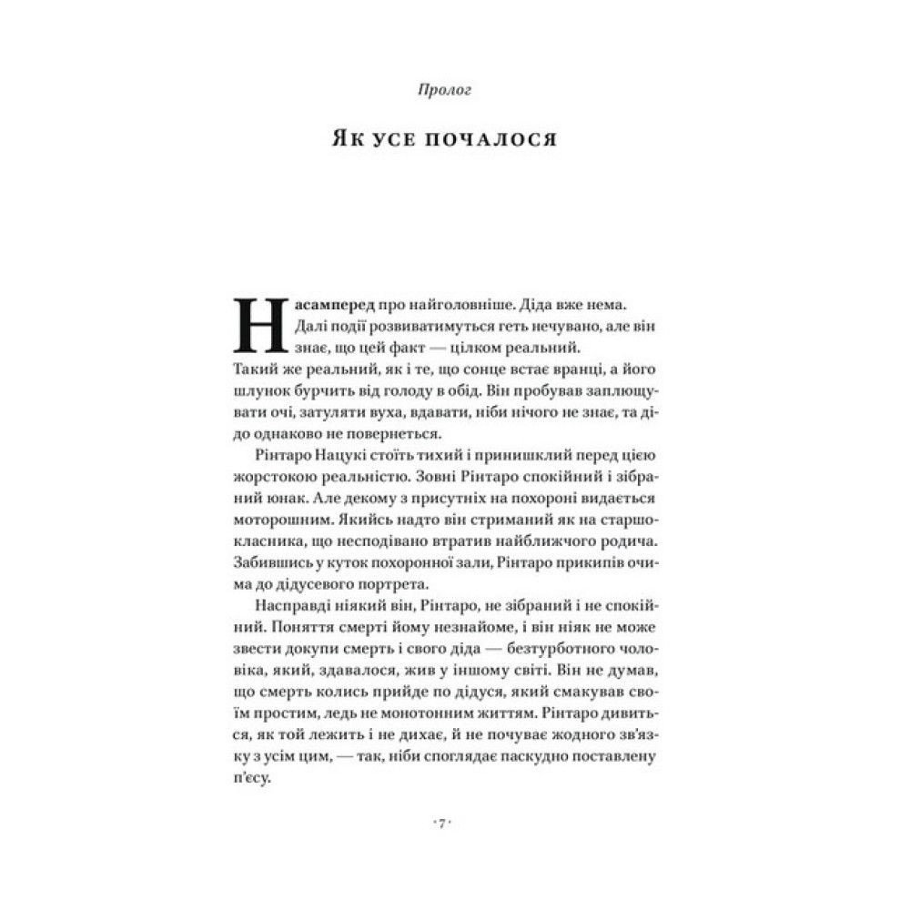 Музика — це щось більше, ніж ноти, а книжки — щось більше, ніж просто слова. Ніж просто папір, тиснена палітурка чи лискучі ілюстрації. Це усвідомлює старшокласник Рінтаро, коли вирушає в магічний лабіринт рятувати книжки. Хлопець ніяк не скидається на супергероя: відлюдькуватий, блідий, худорлявий, у товстих окулярах. Але в нього є одна суперсила — щира любов до книжок. А ще — дивний супутник — кіт Тигр, що прямолінійно варнякає й інколи цитує «Маленького принца». Разом вони виконують три рятівні місії. Рятувати книжки у ХХІ столітті? Від кого? Від людей, які женуться за кількістю, вбивають індивідуальність на догоду спрощенню й видають інформаційний мотлох, поки літературні діаманти припадають пилом. Це зворушлива історія про силу читання, книжкові світи, кохання, цінності, пошук ідентичності й віднайдену сміливість. Цей міжнародний бестселер створений для справжнього книголюба. Тут описана історія про вдячність, емпатію і пошук свого шляху. ПРО АВТОРА Сосуке Нацукава — японський письменник і лікар. Його перша книжка «Медичні картки Бога» одразу стала бестселером у Японії і була видана в 34 країнах. Автор отримав Премію художньої літератури і Премію книгарів Японії. За мотивами першої книжки було знято фільм.