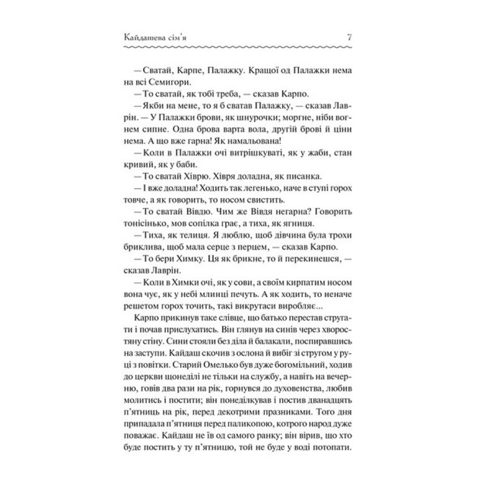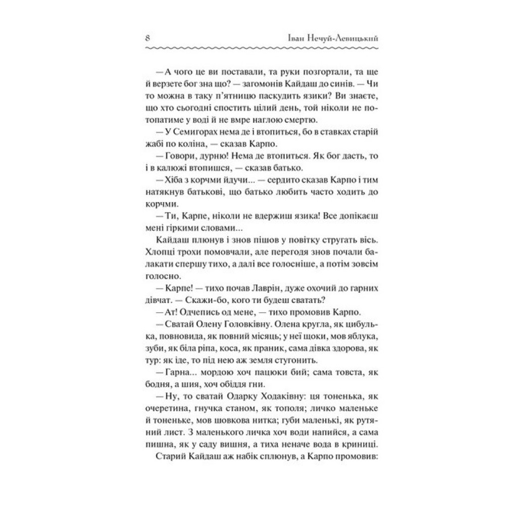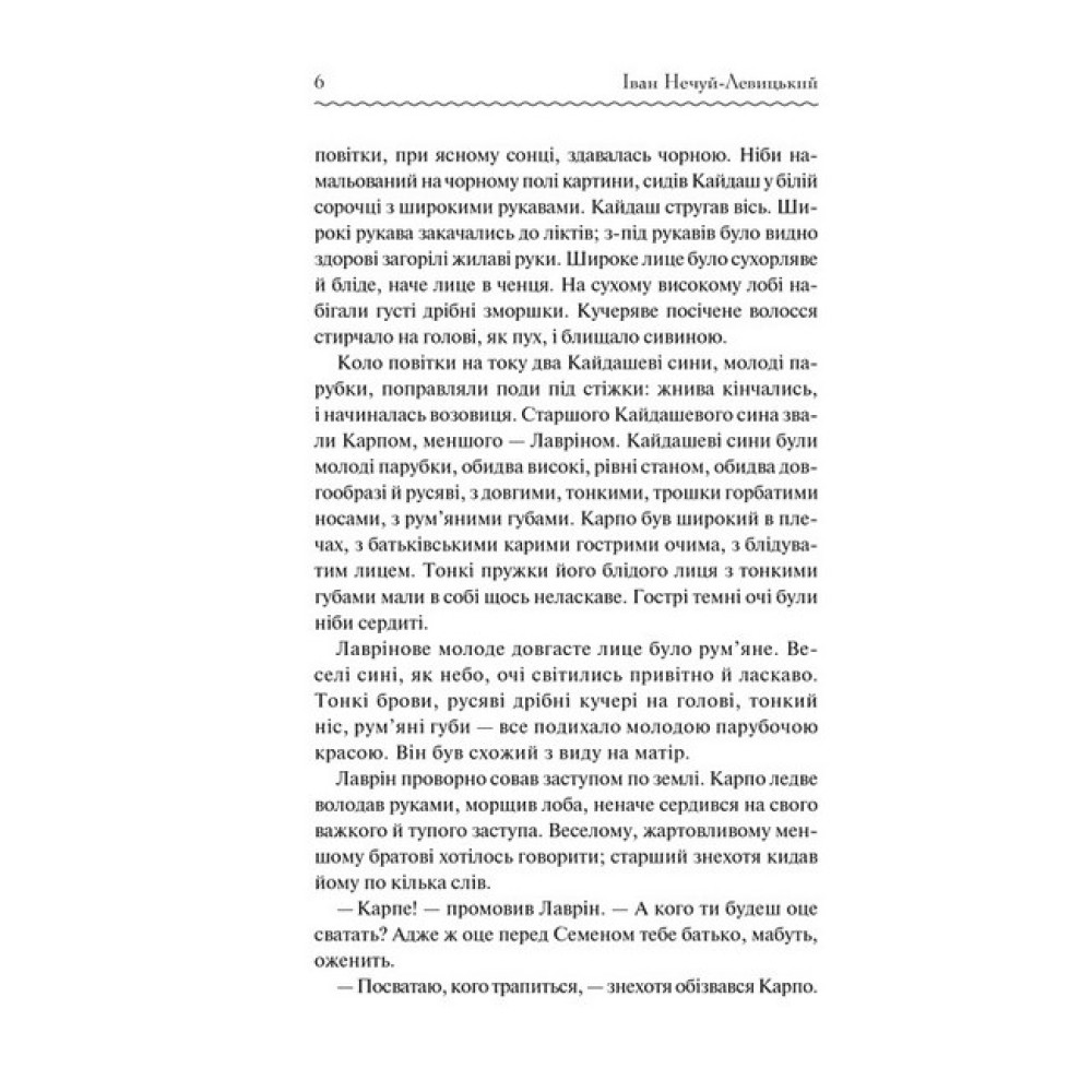 «Воля, бач, дорога річ; за неї варто дорого заплатить».Іван Нечуй-Левицький увійшов в історію української літератури як видатний майстер художньої прози. За півстоліття творчої діяльності він написав понад п’ятдесят романів, повістей, оповідань, п’єс, казок, нарисів, гуморесок, літературно-критичних статей. Найвідомішим твором письменника стала його соціально-побутова повість «Кайдашева сім’я». Твір навіть було екранізовано, а головні ролі у стрічці зіграли відомі українські актори Богдан Ступка і Раїса Недашківська.«Усе змішалося в домі» Кайдашів, коли старший син Карпо одружився з Мотрею. Дівчина — «серце з перцем» одразу не сподобалася прискіпливій свекрусі. Стіни Кайдашевої хати двигтіли від сварок. А коли молодший Лаврін привів наречену Мелашку, то про мир і злагоду забули назавжди! У цій повісті так легко впізнати будні багатьох українських родин. Тут усе як у житті: сміх і сльози, пристрасть і прикрощі, мрії, що розбиваються об землю, і найголовніше — всепереможна любов!