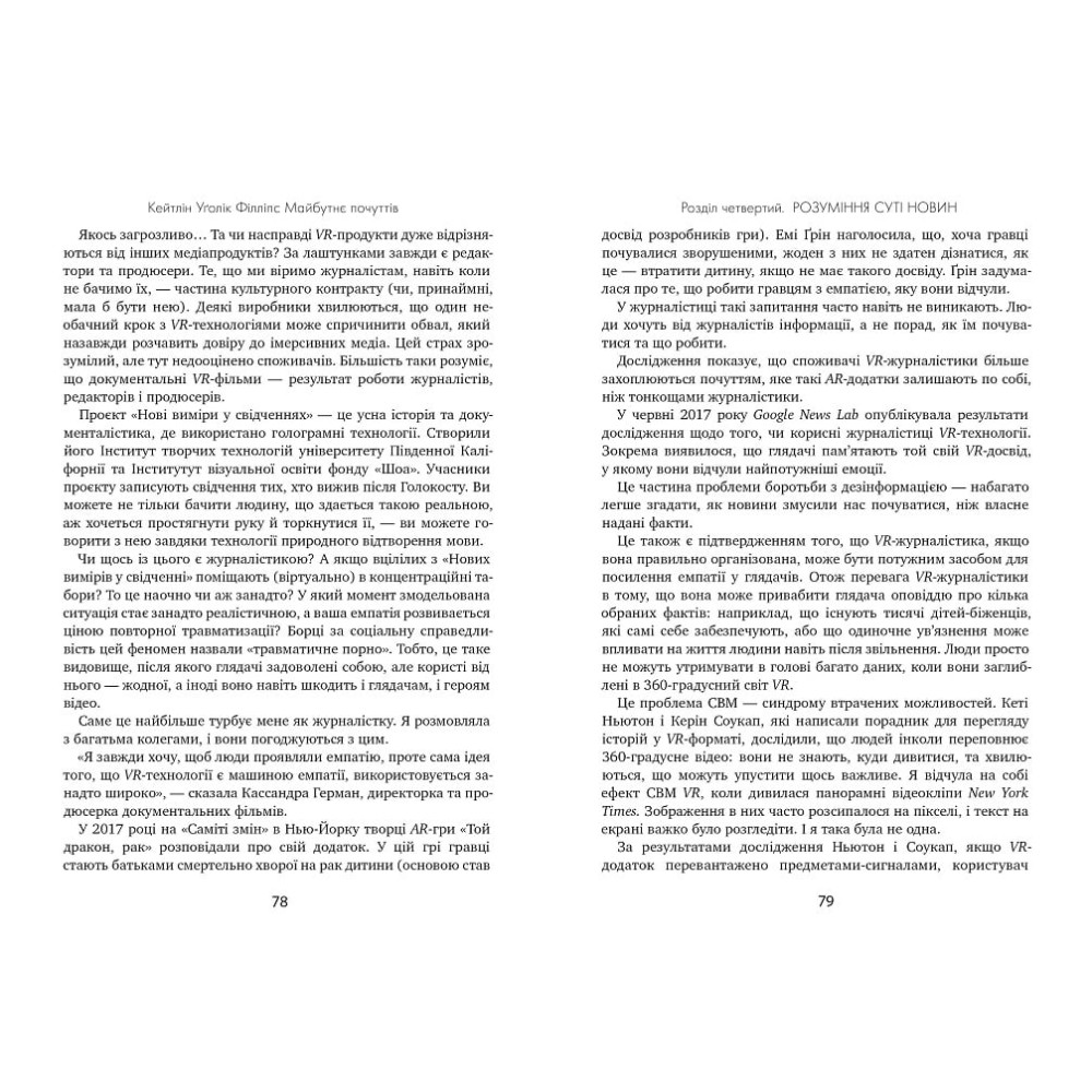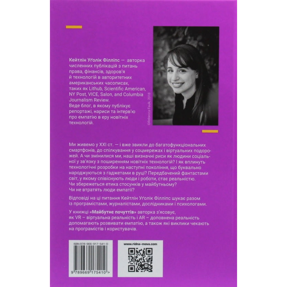 «Майбутнє почуттів» — книжка, присвячена актуальній темі збереження почуттів у сучасному світі, де вчорашня фантастика може стати реальністю сьогодення.Кейтлін Уґолік Філліпс взяла інтерв'ю у науковців, бізнесменів, активістів, безпосередньо пов’язаних з програмуванням, підкріпила їх результатами досліджень щодо впливу новітніх технологій на людину, присмачила текст власними спостереженнями й міркуваннями — і запропонувала читачам книжку, яка зацікавить тих, хто дбає про збереження співчуття, взаєморозуміння і тепла в людських стосунках.