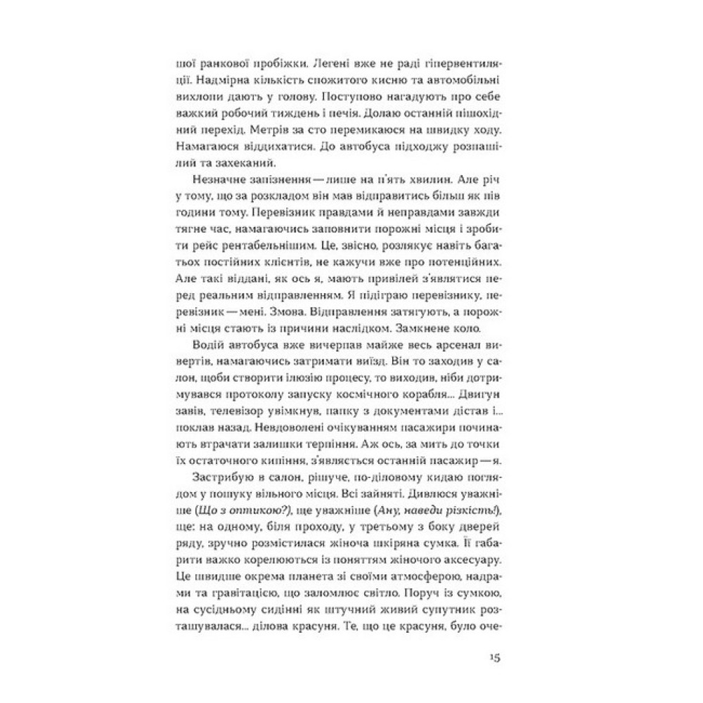 Романтичне знайомство й велика аварія, любовний багатокутник і роздуми про естетику маршруток. Перед нами звичайний рейс «Київ—Рівне». У салоні автобуса безіменний герой опиняється поруч із незнайомкою. Обмежений простір мимоволі створює магію знайомства, неначе це кохання з першого погляду. Та чи така вже випадкова ця зустріч? Паралельно ми бачимо 33-річного Віктора, виснаженого боротьбою за кохання дівчини. Він перебуває у перманентному передчутті якоїсь трагедії і теж прямує до Рівного. У цьому соціально-психологічному романі автор розмірковує про дорогу та поїздки, стосунки й кохання, про те, як минуле впливає на наше теперішнє, а сьогоднішні вчинки — на те, що станеться або не станеться з нами потім. Віталій Живий — письменник, фахівець фінансової сфери, працює бухгалтером у дипломатичній місії.