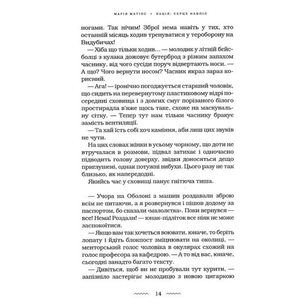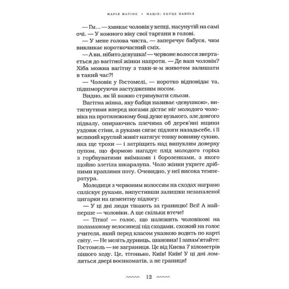 Iсторія іде по спіралі, перемелюючи у своїй машині часу все і всіх. Тому важить не сам час, а людина в подіях часу, бо людина в усі часи перебуває не так під прицілом зброї, як на полі битви між Честю і Безчестям, Любов'ю і Ненавистю, Обов'язком і Зрадою. Цю аксіому провідна українська письменниця Марія Матіос повторює із книжки в книжку і ще раз закарбовує у «Нації: серце навпіл».
