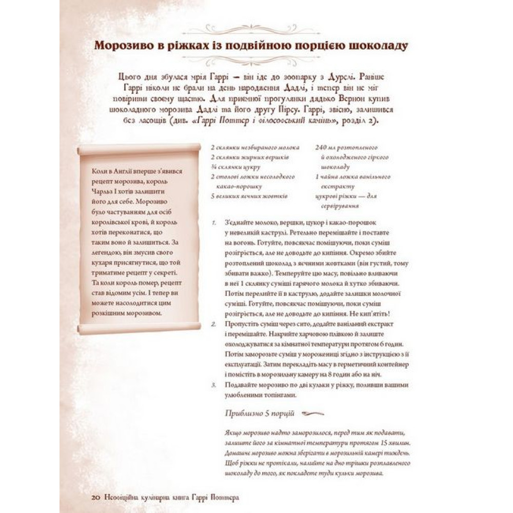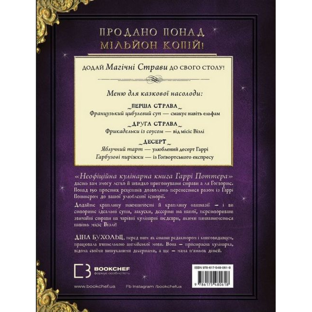 Кухонна магія допоможе кожному читачеві «Неофіційної кулінарної книги Гаррі Поттера» потрапити і до Гоґвордса та почастуватися стравами з бенкетів у Великій залі; і на кухню до велетня Геґріда — скуштувати його дивну їжу; і на гостину до неймовірної тітоньки Візлі, щоб облизати пальці, а то й тарілки, з’ївши приготовану нею смакоту. В основу своєї книги авторка Діна Бухольц поклала страви традиційної британської кухні. Тож це видання стане також і кулінарною мандрівкою островом, на якому з’явився на світ Гаррі Поттер. Усі рецепти випробувані авторкою та мільйонами її читачів, а деякі, зізнаємося, — й перекладачами, редакторами та дизайнерами українського видання «Неофіційної кулінарної книги Гаррі Поттера». Усі рецепти містять докладні пояснення щодо приготування, а окремий розділ із корисними порадами додасть вам іще більшої майстерності навіть у повсякденному приготуванні їжі. «Неофіційна кулінарна книга Гаррі Поттера» стане чудовим подарунком для всіх фанатів романів Дж. Ролінґ.