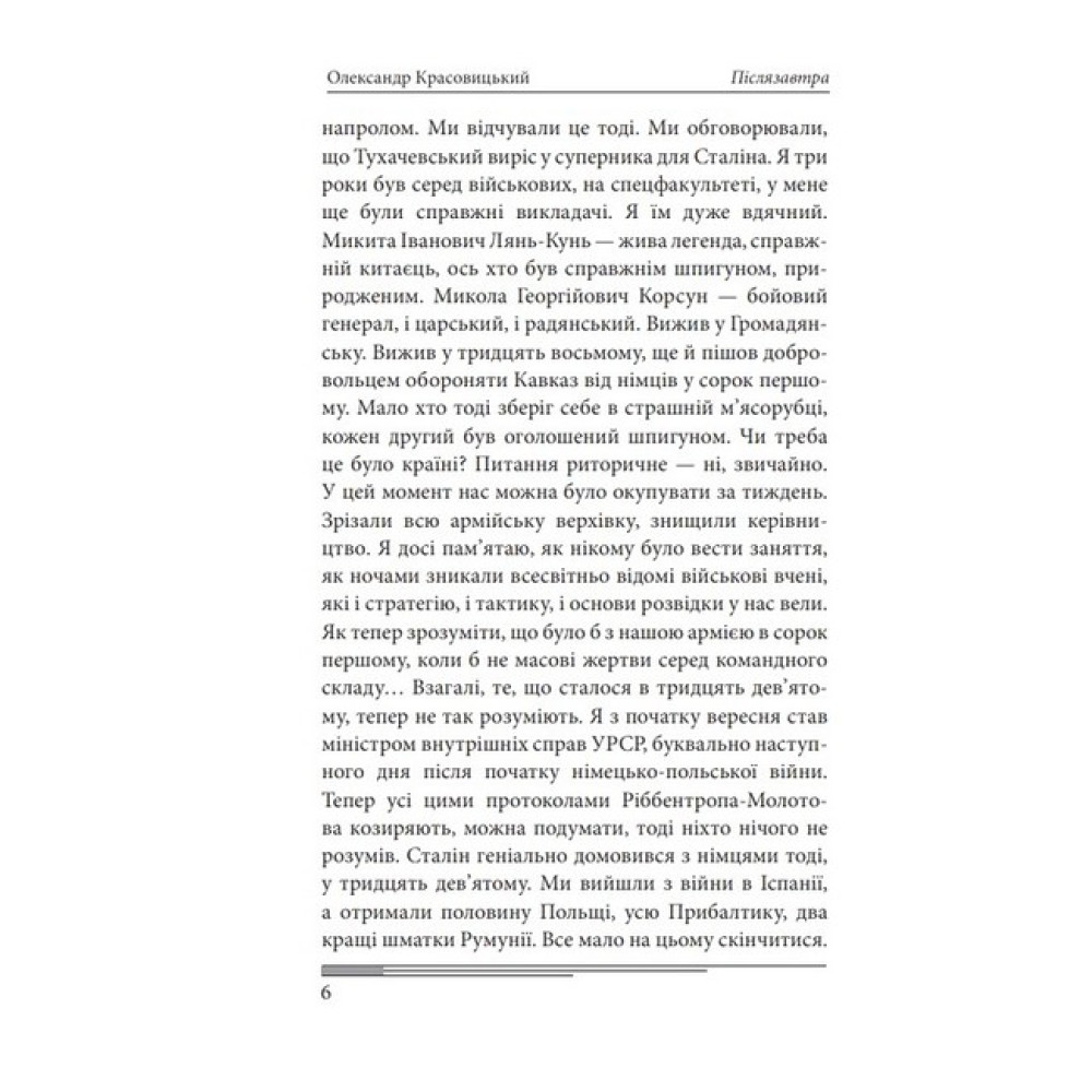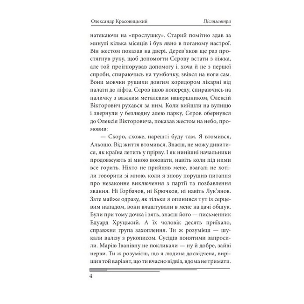 Дія другої частини роману Олександра Красовицького «Післязавтра» відбувається у недалекому майбутньому після похорону російського президента путіна. Те, що здавалося крахом влади після смерті диктатора, обернулося перезавантаженням системи. На зміну старій гвардії приходять їхні онуки. На місці відрубаних голів «гідри ОГП-НКВД-КГБ-ФСБ» виростають нові, більш загрозливі. Вони контролюють величезні кошти та вкладають їх у дестабілізацію та терор по всьому світу. Диктатура переростає в терор проти власного народу та поневолених народів національних республік. Події книги відбуваються у Москві, на Валдаї, Уралі, у Калмикії, Узбекистані, Якутії, Татарстані, Італії, Франції, Швейцарії.