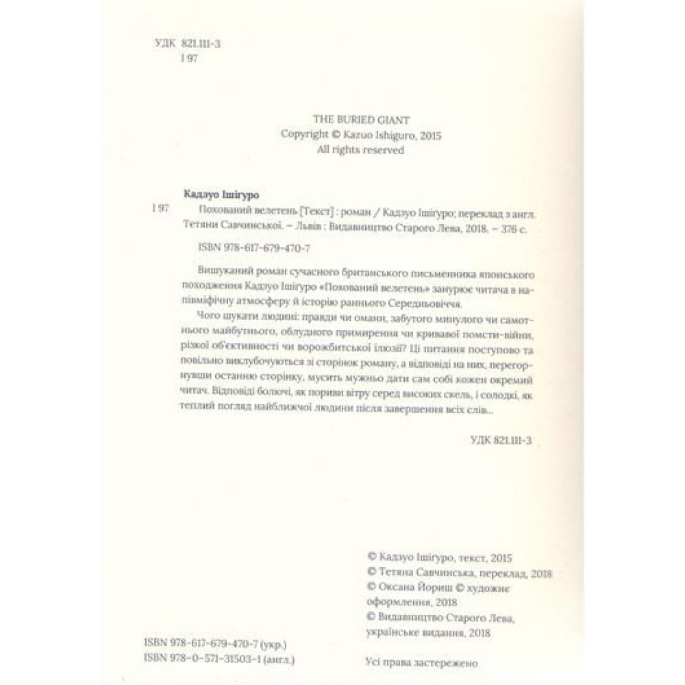 Вишуканий роман сучасного британського письменника японського походження Кадзуо Ішіґуро «Похований велетень» занурює читача в напівміфічну атмосферу й історію раннього Середньовіччя.Чого шукати людині: правди чи омани, забутого минулого чи самотнього майбутнього, облудного примирення чи кривавої помсти-війни, різкої об’єктивності чи ворожбитської ілюзії? Ці питання поступово та повільно виклубочуються зі сторінок роману, а відповіді на них, перегорнувши останню сторінку, мусить мужньо дати сам собі кожен окремий читач. Відповіді болючі, як пориви вітру серед високих скель, і солодкі, як теплий погляд найближчої людини після завершення всіх слів...