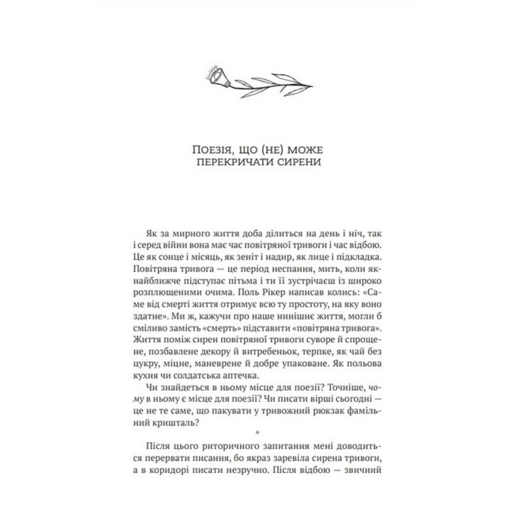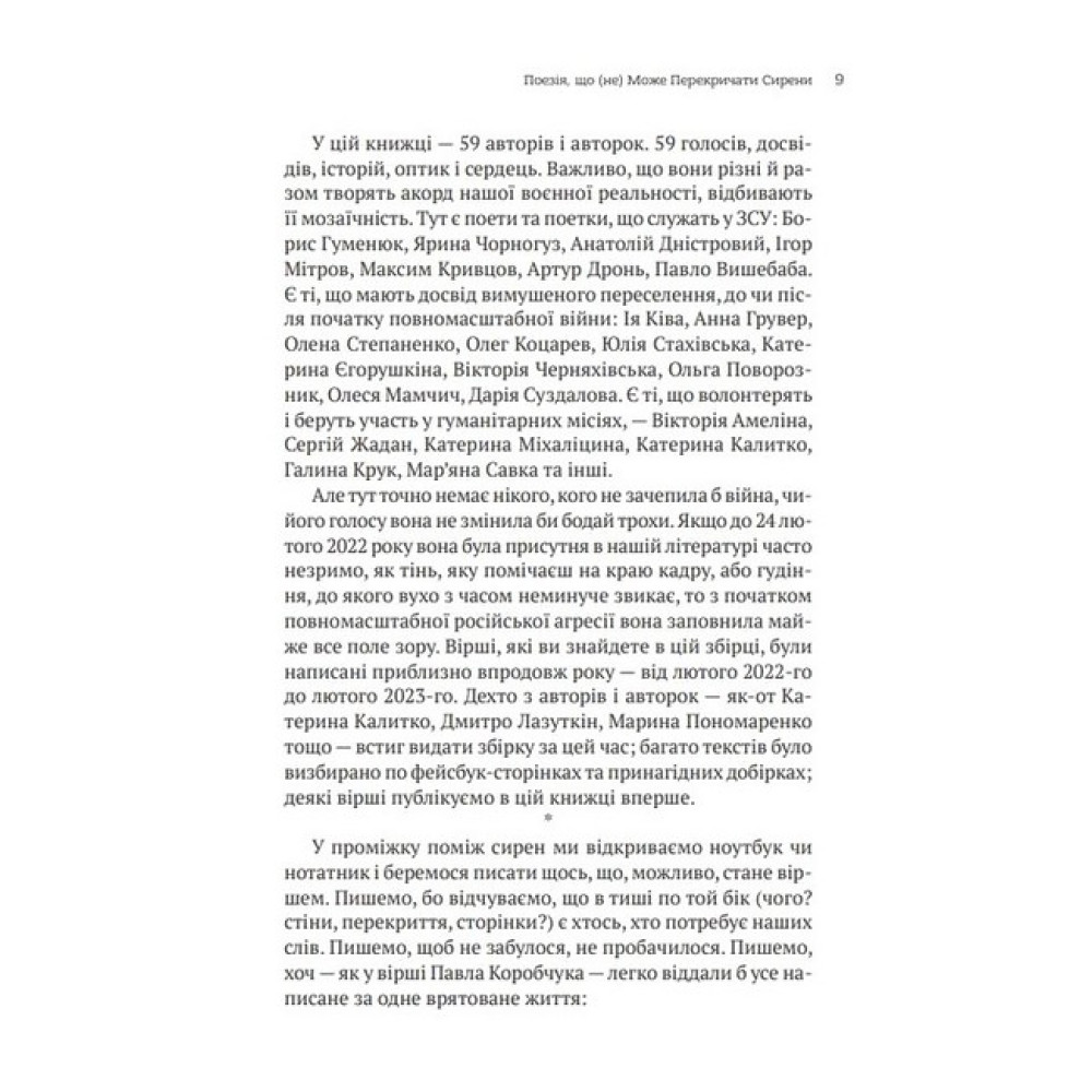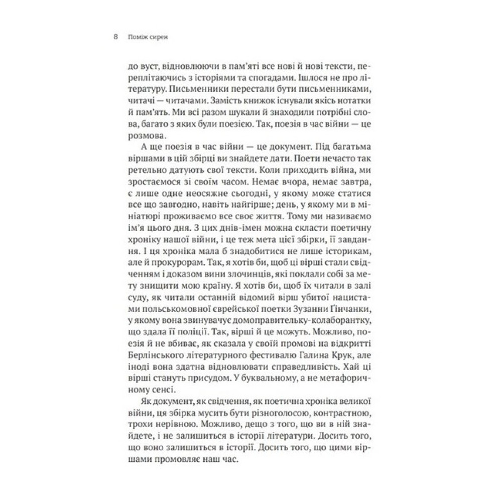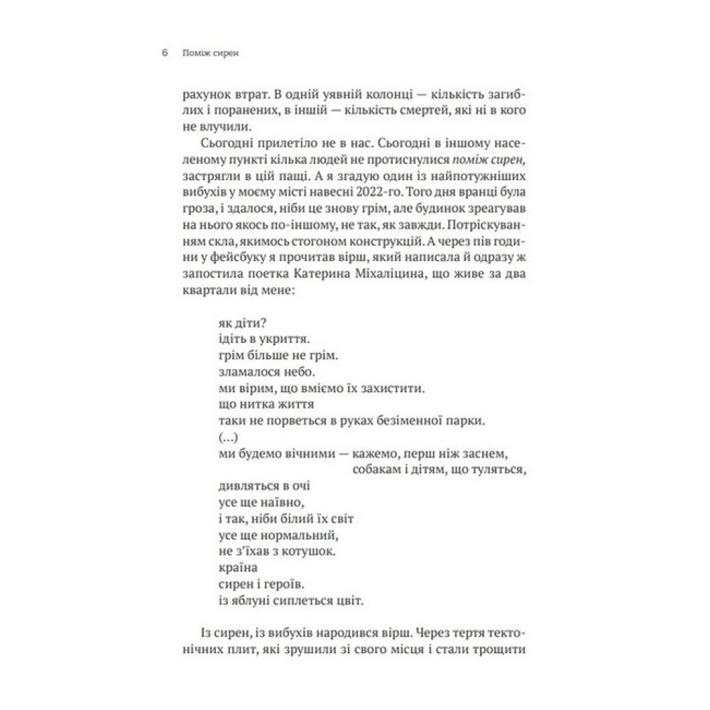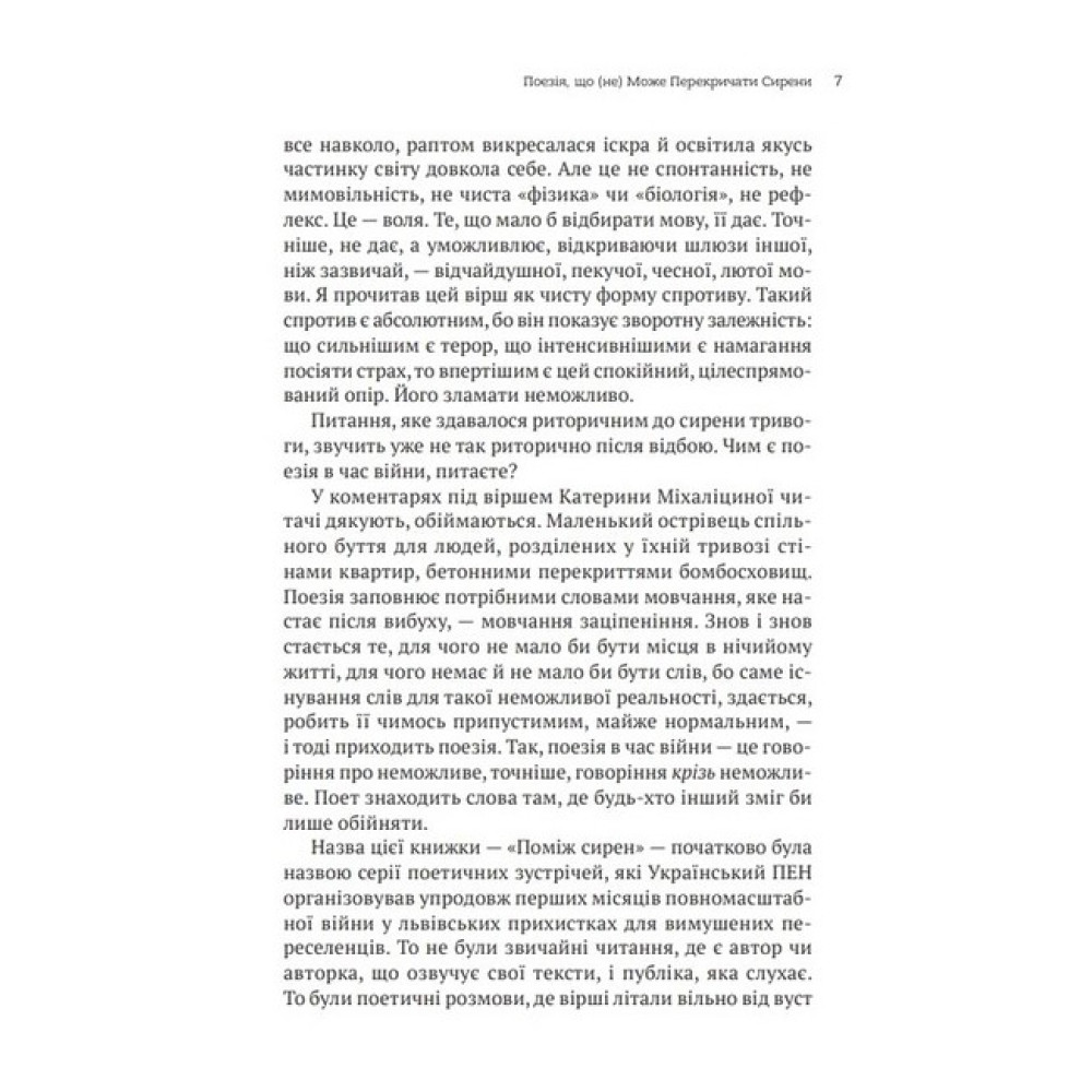 Поетична антологія «Поміж сирен» — свідчення великої війни, що мала нас знищити й обнулити українську культуру. Але всупереч усьому ми вистояли, а наша поезія звучить надпотужно і щиро, єрихонськими трубами руйнує мури, якими обгороджено душі, сягає сердець. Відкритих. Зболених. Чутливих. Сердець, які поміж сирен вчаться жити далі. Доки триває війна росії проти України, ця антологія не може вважатися повною — нові вірші війни пишуть у ЗСУ поміж виїздами на бойові завдання, в дорозі з гуманітарними місіями, в Україні та поза нею. Увібравши голоси 59 сучасних українських поетів і поеток, ця збірка показує, якими ми стаємо в горнилі випробувань: сильними, вразливими, непереможними.Поезія Сергія Жадана, Катерини Калитко, Любов Якимчук, Ярини Чорногуз, Павла Вишебаби, Богдани Матіяш, Ірини Цілик та інших. «Як документ, як свідчення, як поетична хроніка великої війни ця збірка мусить бути різноголосою, контрастною, трохи нерівною. Цими віршами говорить наш час». Упорядник Остап Сливинський