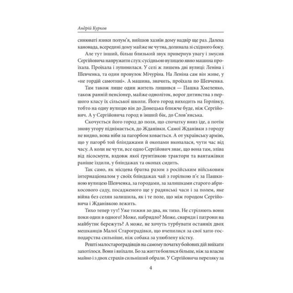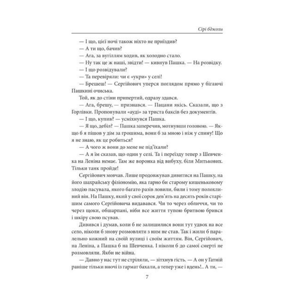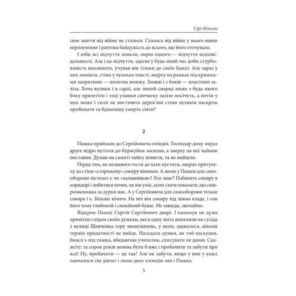 Андрій Курков — журналіст, письменник, сценарист (за його сценаріями знято понад 20 документальних та художніх фільмів), автор більш як 20 книг. Його твори перекладено 42 мовами світу, зокрема англійською, німецькою, французькою, іспанською, голландською, турецькою та багато інших. Книжки Куркова потрапили до топ-десятки європейських бестселерів. Роман «Сірі бджоли» відзначено престижною літературною нагородою — Національною премією Медічі (Франція) за найкращий закордонний твір. ...У селі Мала Староградівка, яке знаходиться в так званій сірій зоні, залишилися жити лише двоє — пенсіонер сорока дев’яти років Сергій Сергійович і його колишній однокласник Пашка. І вони, маючи абсолютно протилежні погляди на життя, змушені миритися, хоча до одного заходять в гості українські військові, а до іншого — сепаратисти. Головна турбота Сергійовича — як і куди з настанням весни відвезти подалі від війни своїх бджіл — всі шість вуликів. Відвезти туди, де не стріляють, щоб згодом у меду не було присмаку війни.