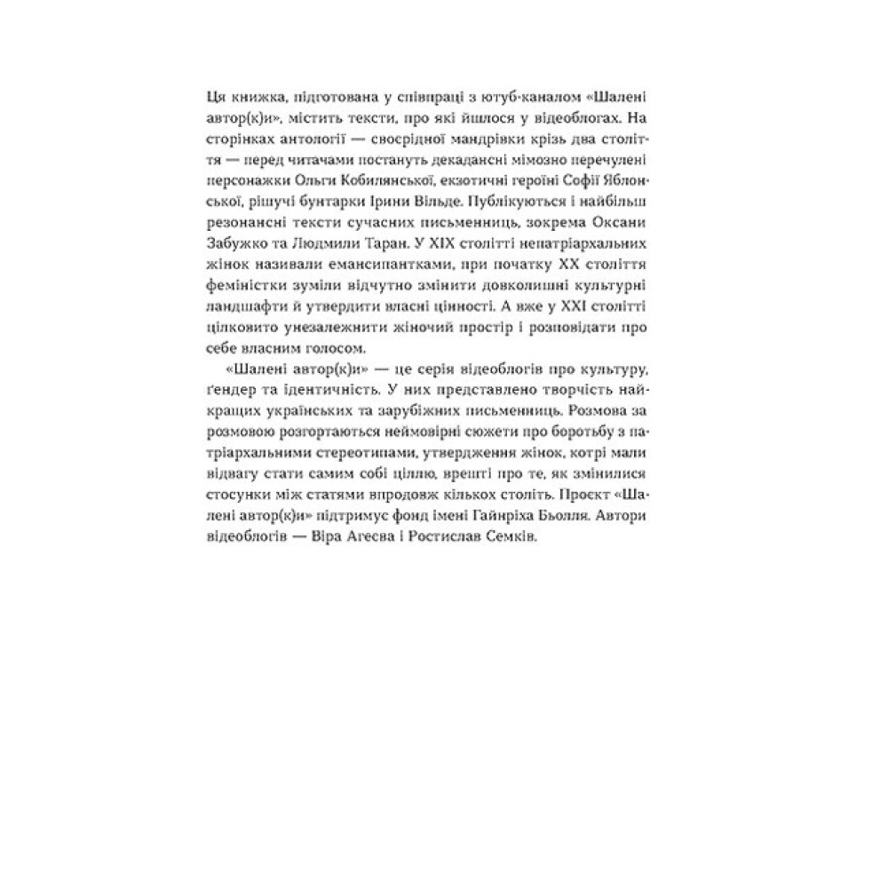 Автор | Ірина Вільде, Марко Вовчок, Леся Українка, Олена Пчілка, Людмила Таран, Оксана Забужко Рік 2023 Мова Українська Ілюстрації Чорно-білі Жанр Збірник, Українська проза350 ? Все про “Шалені авторки. Мала проза українських письменниць” Від видавця «Шалені авторки» — це антологія текстів українських письменниць, своєрідна мандрівка крізь останні два століття, під час якої різні авторки, маючи несхожі стильові уподобання й естетичні орієнтації, змальовують усю множинність і складність жіночого досвіду.Перед читачами постануть декадансні персонажки Ольги Кобилянської, екзотичні героїні Софії Яблонської, рішучі бунтарки Ірини Вільде. Публікуються і найбільш резонансні тексти сучасних письменниць, зокрема Оксани Забужко і Людмили Таран.Книжка підготована у співпраці з ютуб-каналом «Шалені автор(к)и», авторами якого є літературознавці Віра Агеєва й Ростислав Семків. Рецензії 0 Всі характеристики ВидавництвоВіхола |