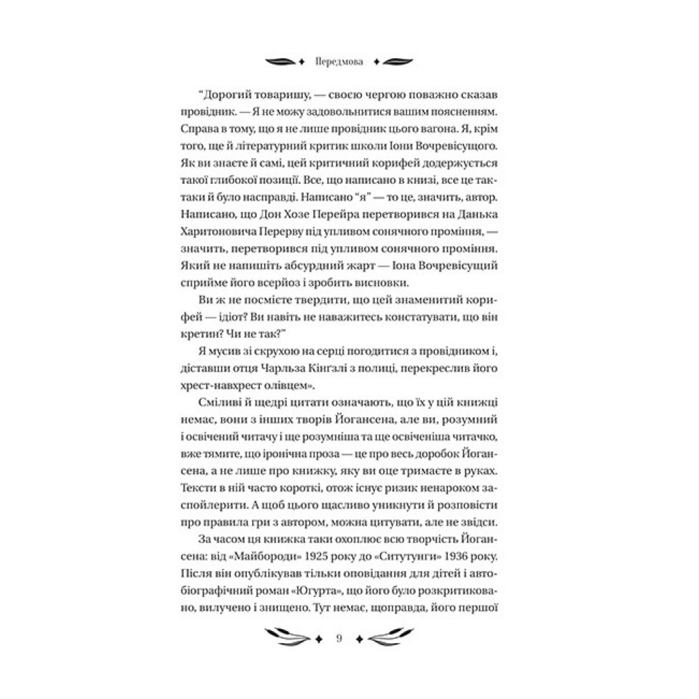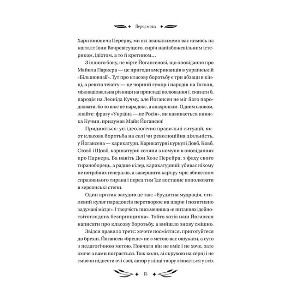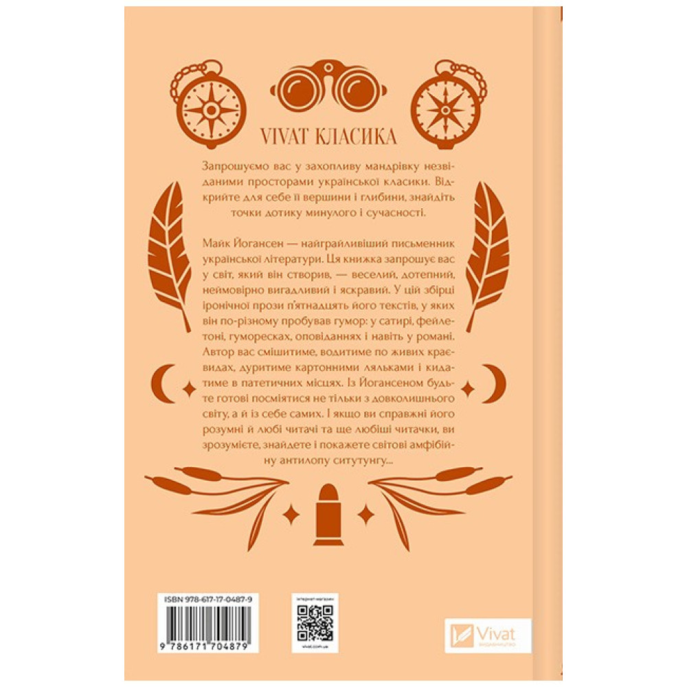 Майк Йогансен — найграйливіший письменник української літератури. Ця книжка запрошує вас у світ, який він створив, — веселий, дотепний, неймовірно вигадливий і яскравий. У цій збірці іронічної прози п’ятнадцять його текстів, у яких він по-різному пробував гумор: у сатирі, фейлетоні, гуморесках, оповіданнях і навіть у романі. Автор вас смішитиме, водитиме по живих краєвидах, дуритиме картонними ляльками і кидатиме в патетичних місцях. Із Йогансеном будьте готові посміятися не тільки з довколишнього світу, а й із себе самих. І якщо ви справжні його розумні й любі читачі та ще любіші читачки, ви зрозумієте, знайдете і покажете світові амфібійну антилопу ситутунгу...