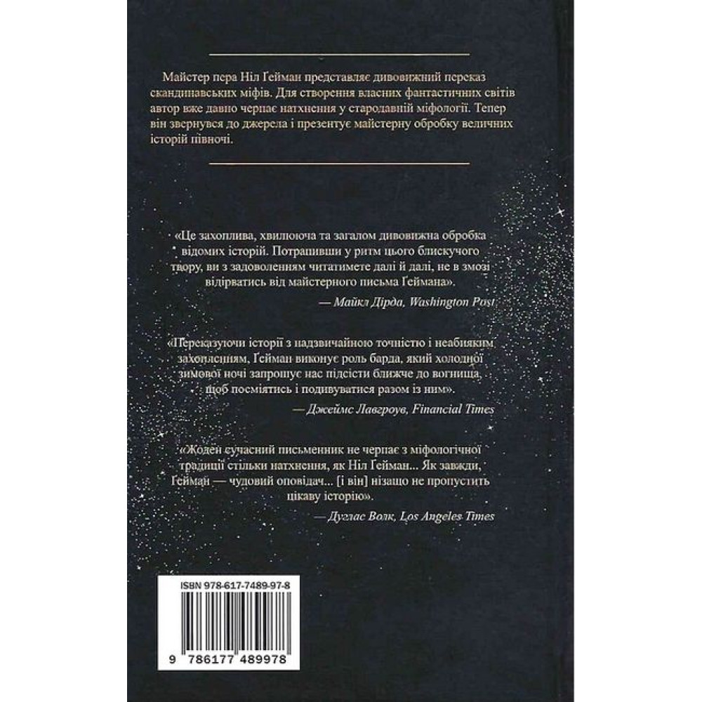 Знайомтесь із майбутнім бестселером — майстер пера Ніл Ґейман представляє дивовижний переказ величних скандинавських міфів. Автор вже давно черпає натхнення для створення власних фантастичних світів у стародавній міфології. Тепер він звернувся до джерела і презентує майстерну обробку величних історій півночі. Для створення фантастичного царства у своїх романах Ніл Ґейман неодноразово звертався до давньої міфології. Та тепер він звертається до самого витоку своєї творчості, представляючи нам неймовірну версію величних північних казок. Автор залишається вірним міфам та пантеону скандинавських богів: Одін, головний бог, розумний, сміливий і хитрий Тор, син Одіна, неймовірно сильний та не наймудріший з богів Локі - син велетнів — кровний брат Одіна, ошуканець і неперевершений маніпулятор. Історія розпочинається з генезису легендарних дев'яти світів, занурюючи нас у подвиги божеств, карликів і велетнів. Для того, щоб повернути собі викрадений славнозвісний молот, Тору необхідно замаскуватися у жінку, що дуже важко зробити, беручи до уваги його бороду і величезний апетит. Гірка доля спіткає Квазіра — найпрозорливішого з богів — кров якого перетворюється в мед. Врешті все завершується Рагнароком, сутінками богів і відродженням нового часу та людей. Ніл Ґейман - автор бестселерів "Американські боги", "Океан у кінці вулиці", "Небудь-де", "Добрі передвісники" (у співавторстві з Террі Пратчеттом) та інших лауреат численних літературних нагород, зокрема премій "Г'юго" та "Неб'юла", медалей "Ньюбері" та "Карнеґі".Скандинавська міфологія