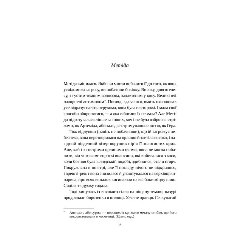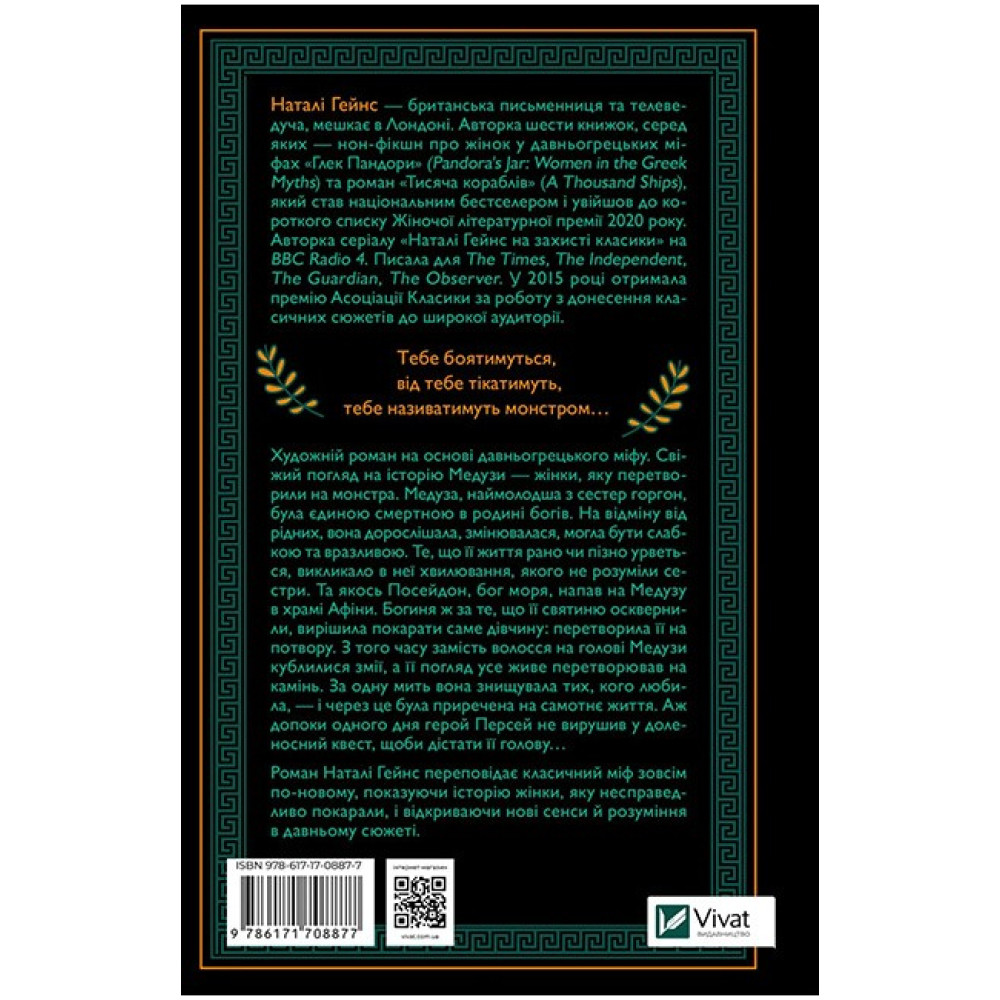 Художній роман на основі давньогрецького міфу. Свіжий погляд на історію Медузи — жінки, яку перетворили на монстра. Медуза, наймолодша з сестер горгон, була єдиною смертною в родині богів. На відміну від рідних, вона дорослішала, змінювалася, могла бути слабкою та вразливою. Те, що її життя рано чи пізно урветься, викликало в неї хвилювання, якого не розуміли сестри. Та якось Посейдон, бог моря, напав на Медузу в храмі Афіни. Богиня ж за те, що її святиню осквернили, вирішила покарати саме дівчину: перетворила її на потвору. З того часу замість волосся на голові Медузи кублилися змії, а її погляд усе живе перетворював на камінь. За одну мить вона знищувала тих, кого любила, — і через це була приречена на самотнє життя. Аж допоки одного дня герой Персей не вирушив у доленосний квест, щоби дістати її голову…