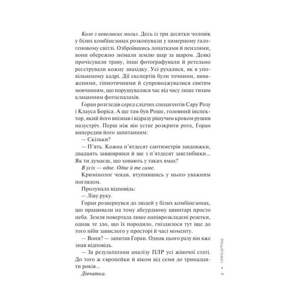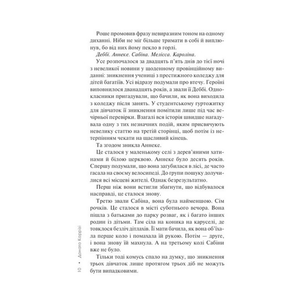 Шість дівчаток зникають одна за одною. Шість могилок знайдено в лісі, в кожній з них - дитяча рука. Але відшукати постраждалих чи їхні тіла поліції не вдалося. За справу беруться Міла Васкес, яка спеціалізується на розшуку викрадених дітей, і талановитий криміналіст Ґоран Ґавіла. З кожною знайденою зачіпкою справа стає дедалі складнішою, адже виявлені факти суперечать один одному, а сіра зона між добром і злом стрімко ширшає... Про автора: Донато Каррізі - італійський письменник, сценарист, журналіст і режисер. Світ художньої літератури дізнався про Каррізі з виходом його першого роману «Нашіптувач», що здобув славу світового бестселера. Наступні книжки автора одна за одною ставали сенсаціями. Каррізі успішно дебютував як режисер-постановник, знявши фільм за мотивами власного роману «Дівчина в тумані» із Жаном Рено у головній ролі.