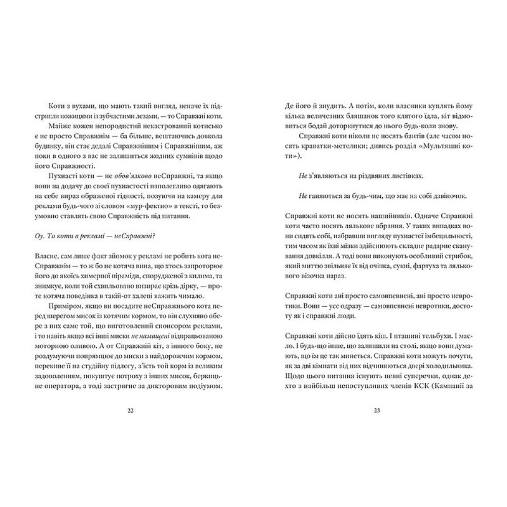 Справжнісінькі коти переконані, що їм належить увесь світ, вони зухвалі та самовпевнені, сильні та незалежні. Ще невідомо, хто в хаті господар: ви чи ваш кіт (якщо він справжній, звісно)? Такі коти не носять протиблошиних нашийників, не з’являються на різдвяних листівках, не ганяються за будь-чим, що має на собі дзвіночок, але добре чують, як за дві кімнати від них відчиняються двері холодильника. Перед вами гумористична міні-енциклопедія, дотепний трактат від майстра іронічної прози Террі Пратчетта, що змальовує всі котячі хитрощі, незбагненний шарм і справжню натуру наших улюбленців.
