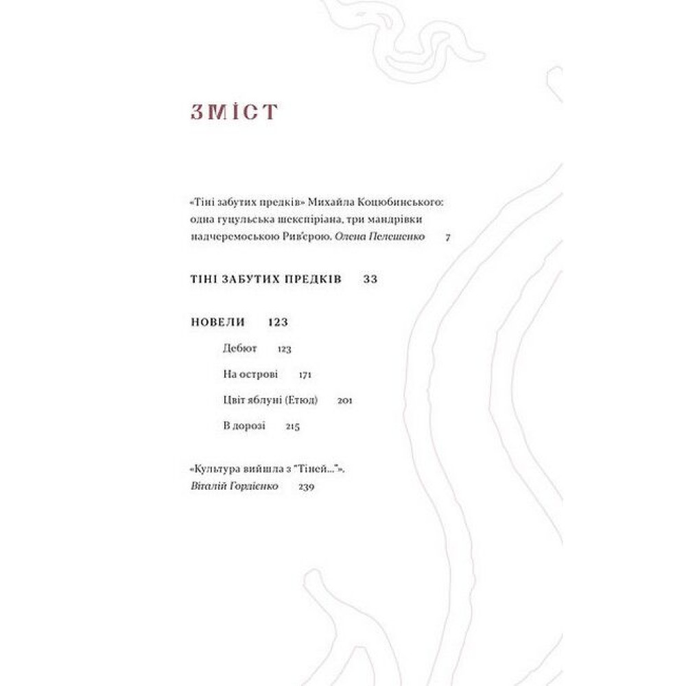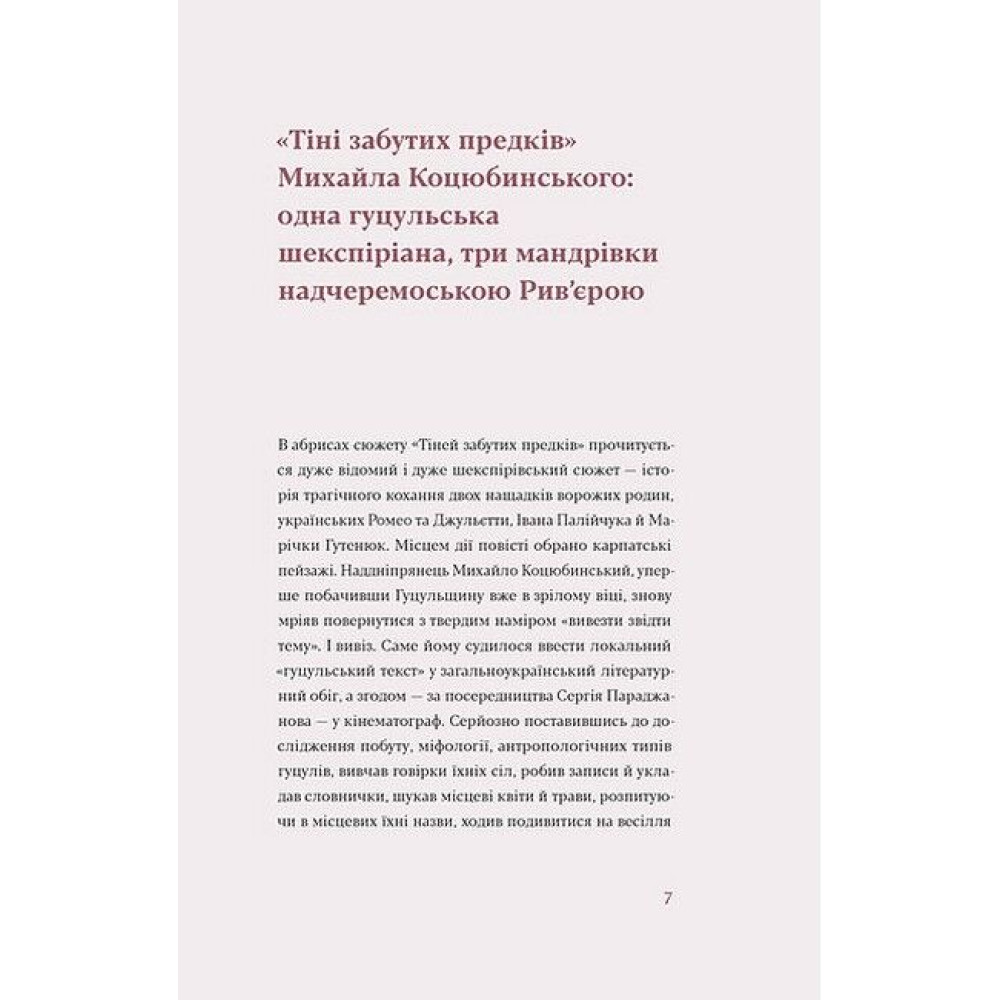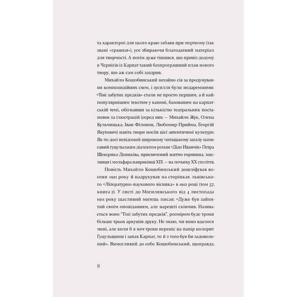 «Тіні забутих предків» — це історія кохання двох нащадків ворожих родин, таких собі українських Ромео і Джульєтти — Івана й Марічки, що розгортається посеред карпатських гір. Власне самі Карпати у цьому тексті виступають неначе окремим персонажем, переповненим легендами та духами. Коцюбинський надзвичайно відповідально поставився до відтворення світу гуцульських вірувань і традицій. Він досліджував побут і говірки гуцульських сіл, укладав словнички, шукав місцеві квіти й трави, ходив на весілля та інші традиційні ритуали. Усе це, аби максимально достовірно передати атмосферу того куточка світу. Чугайстер, щезник, мавка і мольфари, які закликають негоду. А поряд з цим кохання, важкий вибір між любов'ю небесною та любов'ю земною. Вигадане і справжнє, язичницьке та християнське, усе сплітається в одну історію, де духи правлять людиною, людина — духами, а сама реальність стає частиною міфу.