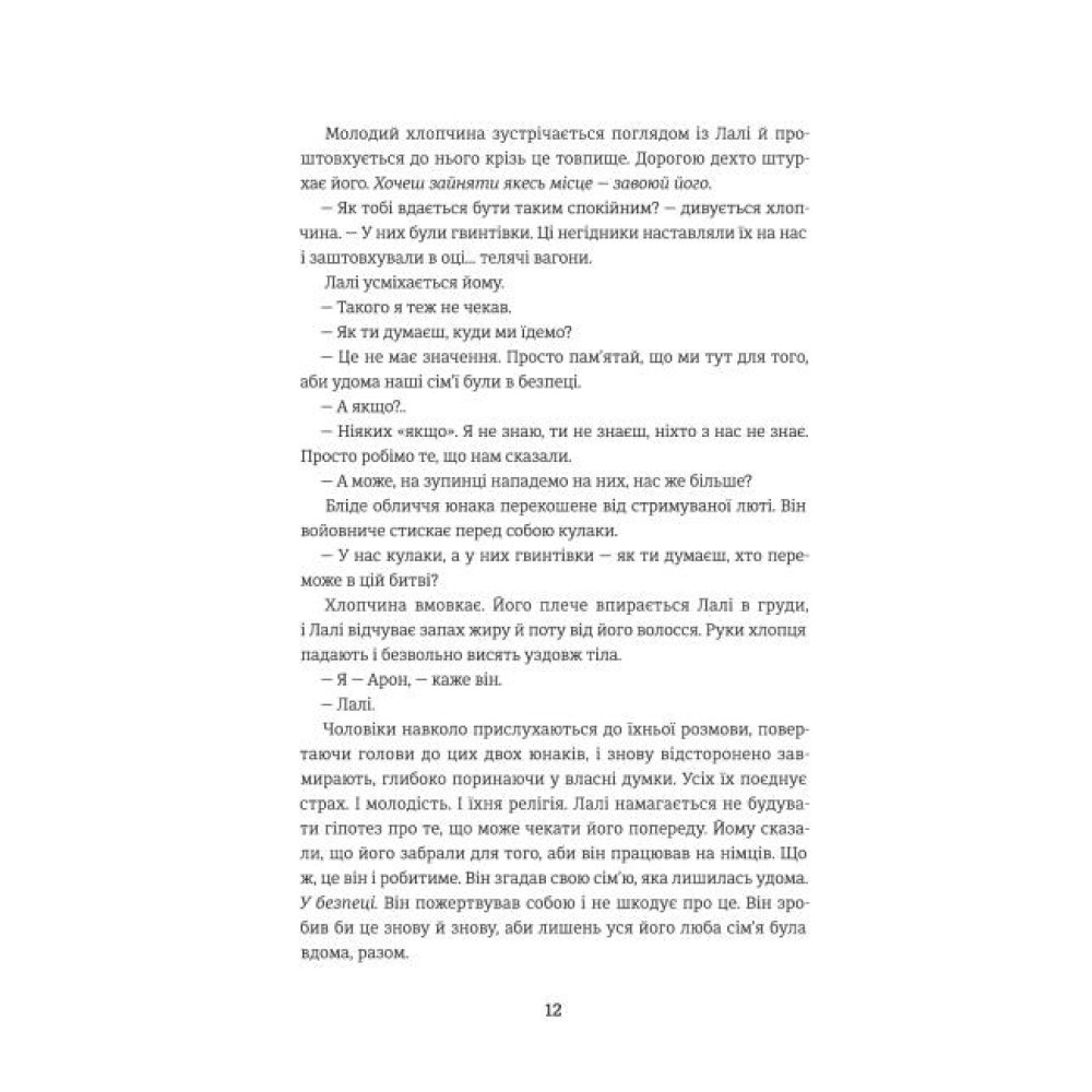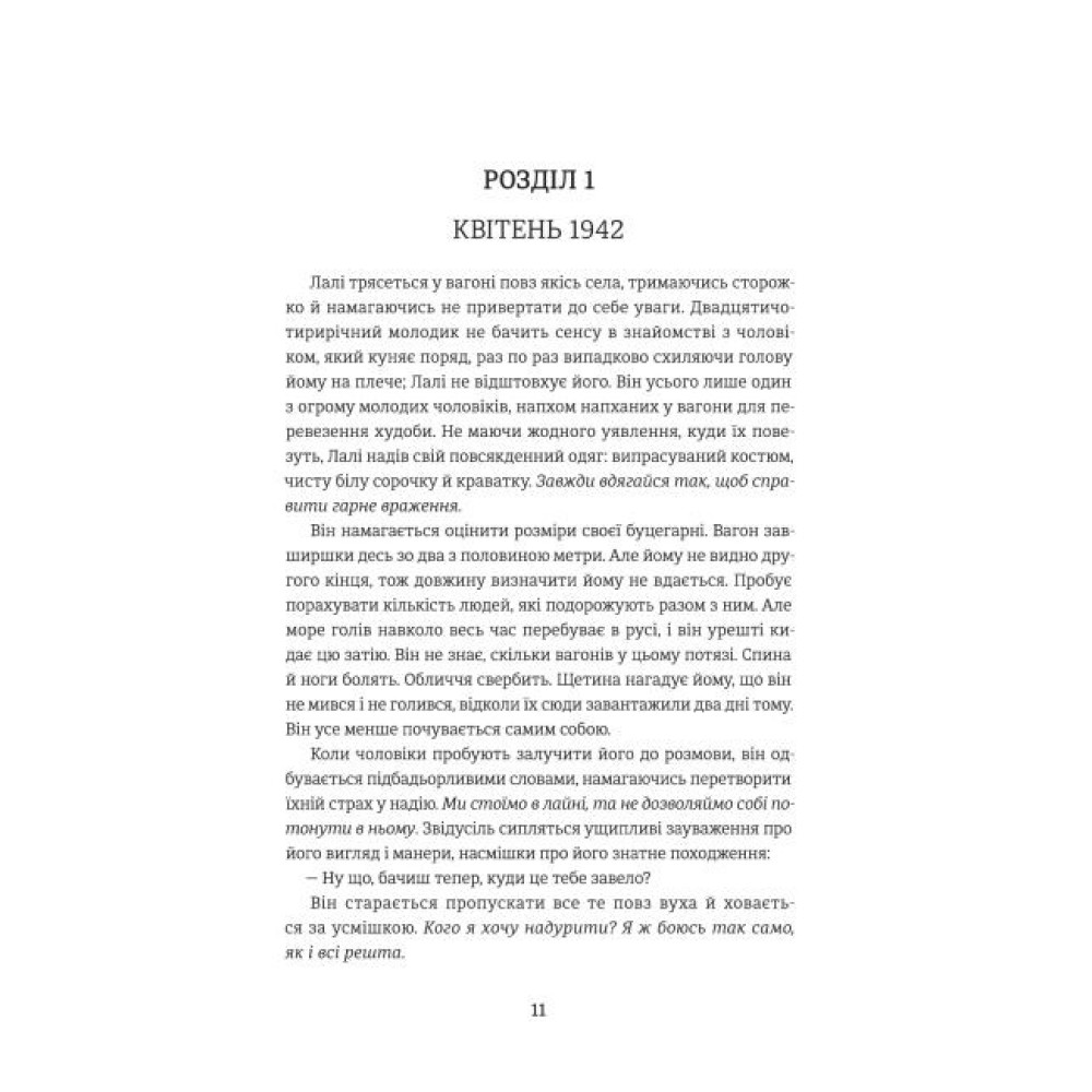 Дебютний роман австралійської письменниці Гізер Морріс про силу кохання, віри й внутрішнього спротиву, завдяки яким можна пройти крізь найтяжчі випробування. Книжку написано на основі реальних подій. У 1942 році у концентраційному таборі «Аушвіц» зустріли одне одного Лалі Соколов та Гіта Фурман. У неї стерлося татуювання з порядковим номером, він мав набити новий Це було кохання з першого погляду. Молодим людям судилося пережити страшні випробування, розлуку й омріяне возз’єднання, яке переросло у 56 років щасливого подружнього життя. Їхню історію кохання записала Гізер Морріс зі слів самого Лалі, з яким авторка випадково познайомилася 2003 року. Ця зустріч змінила долі обох. Відчуваючи до Гізер довіру, літній чоловік наважився розповісти їй найпотаємніші подробиці свого життя під час Голокосту. Спочатку Гізер написала історію Лалі у формі сценарію, який був високо поцінований на міжнародних конкурсах, а згодом перетворила його на свій дебютний роман «Татуювальник Аушвіцу».
