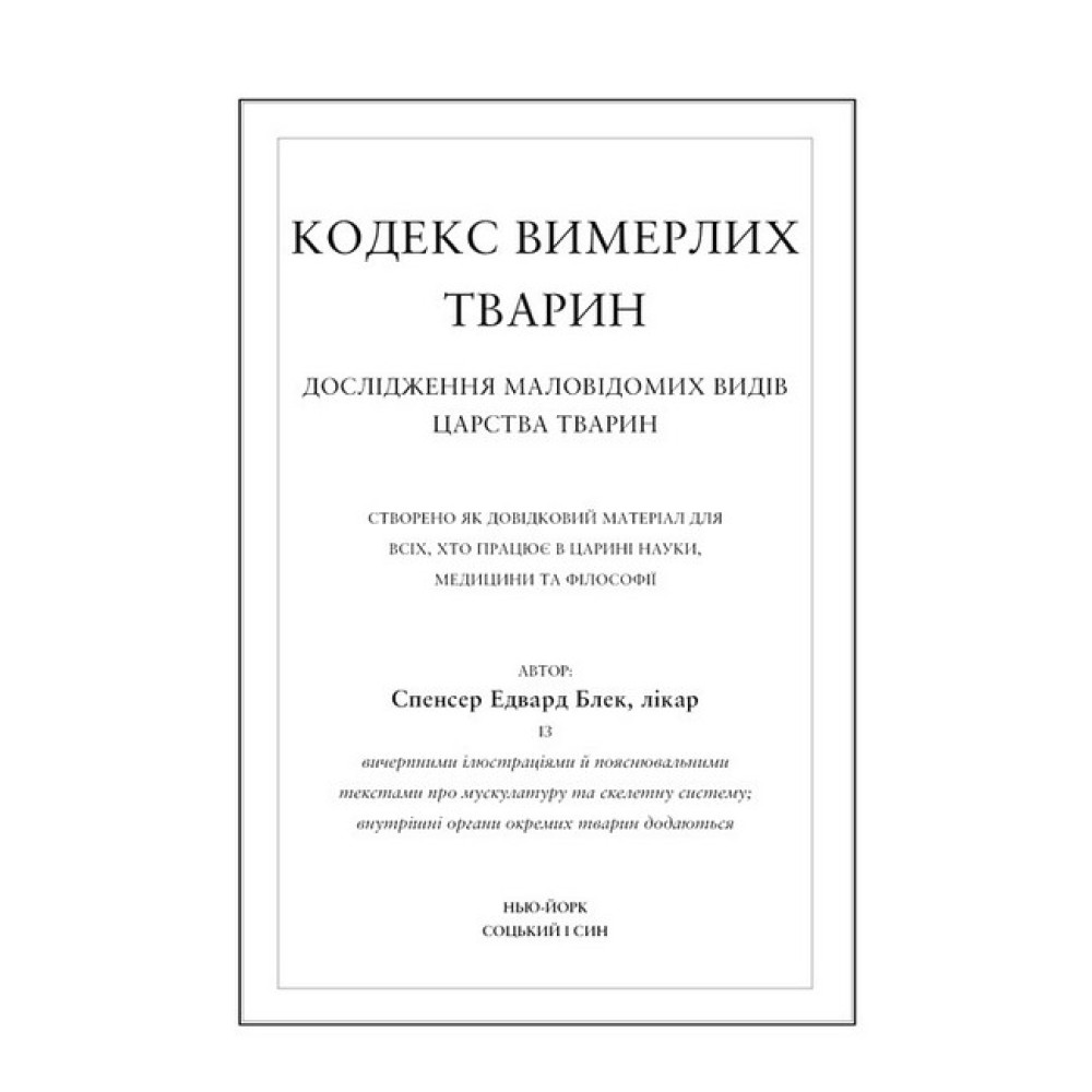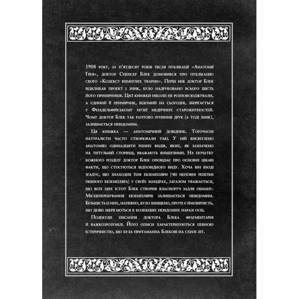 Друга половина XIX століття. Часи зародження сучасної медицини. На заваді дослідженням стають гласні й негласні перепони, породжені забобонами, як-от законодавчі обмеження щодо роботи з людськими трупами. Проте лікарі все ж таки удосконалюють хірургію та анестезію, гігієну в медицині та знання про причини хвороб. У цих умовах і зростає юний геній медицини Спенсер Блек. Він рано втратив батьків, однак здобув освіту в Академії медицини, а згодом своїми успіхами підняв її престиж до неймовірних висот. Блек зосереджується на незвичайній темі — вроджених патологіях людського організму. Розділити зрослі пальці? Видалити зайву руку? Для Спенсера Блека немає нічого неможливого! Згодом наполеглива праця приносить йому визнання і гроші. У цей період він зустрічає однодумницю й кохану людину. Однак щасливе сімейне життя лікаря триває недовго. А все через його хворобливу одержимість роботою.Однією із найсуперечливіших його гіпотез є: а що, як стародавні міфи правдиві? Що як істоти, які наразі існують лише у світових легендах, жили насправді й були нашими предками? Що як пам’ять про їхню будову досі проявляється в тілах окремих людей? Неприйняття з боку наукової спільноти не спиняє Блека, і він вирішує повідомити свої ідеї широкому загалу через мистецтво. Видовищні шоу, майстерно виготовлені опудала, дивовижні операції просто на сцені — усе, щоб показати, якою могла бути стародавня фауна... А наостанок — загадковий «Кодекс вимерлих тварин». За своє життя Спенсер Блек устиг написати чимало праць про свої дослідження, які не залишали наукову спільноту байдужою. Проте його вершинним твором можна назвати саме «Кодекс» — роботу, яка тривалий час залишалася недоступною читачеві. Тепер же з нею можна ознайомитися на сторінках цього видання — оцінити детальні замальовки тварин, прочитати, як доктор Блек полював на рештки легендарних істот по всьому світу. Чи справді автор «Кодексу» побачив і пережив усе, що описав на його сторінках? Вирішувати вам.