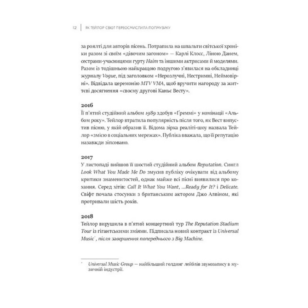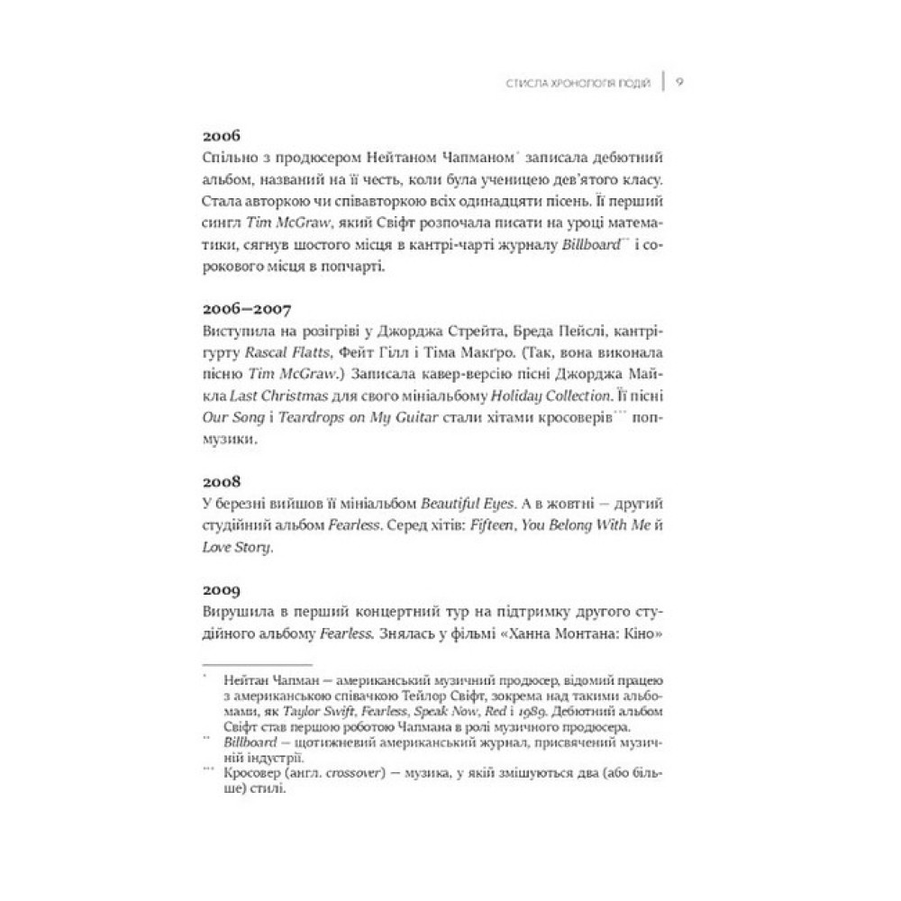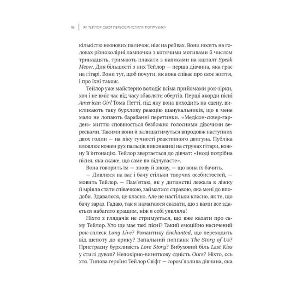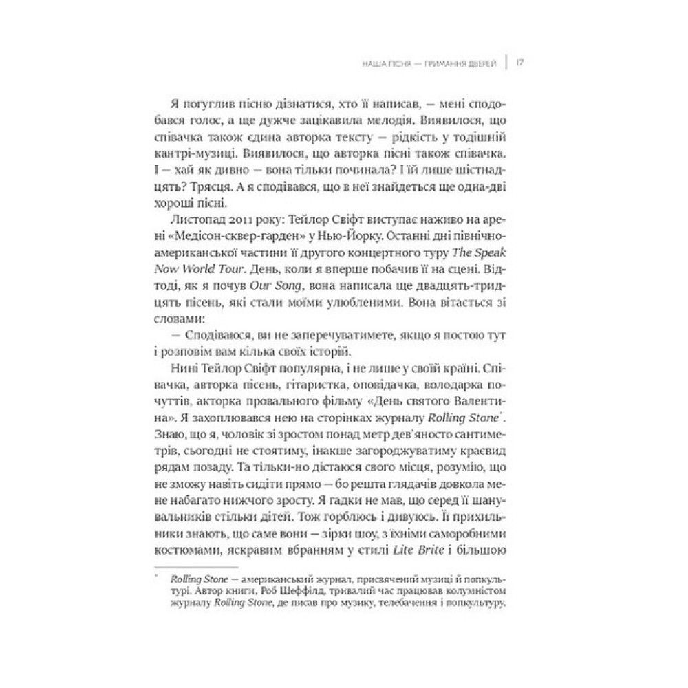 Її музика стирає кордони між поколіннями й культурами. Такої постаті, як Тейлор Свіфт, світ іще не знав. Нині вона на піку популярності, культурного й комерційного впливу, приголомшливої активності та творчості. А втім, Тейлор не полишає цього рівня впродовж останніх вісімнадцяти років.Ніхто не розповість цю історію краще, ніж Роб Шеффілд — автор бестселерів і лауреат премій, відомий за книжками Dreaming the Beatles, On Bowie та Love Is a Mix Tape. Легендарний журналіст Rolling Stone, який висвітлював кар'єру Тейлор на кожному її етапі — від перших кроків до туру Eras. Шеффілд проникає в саму суть Свіфт, її музики, текстів, зв’язку з фанатами та потужної емоційної сили.