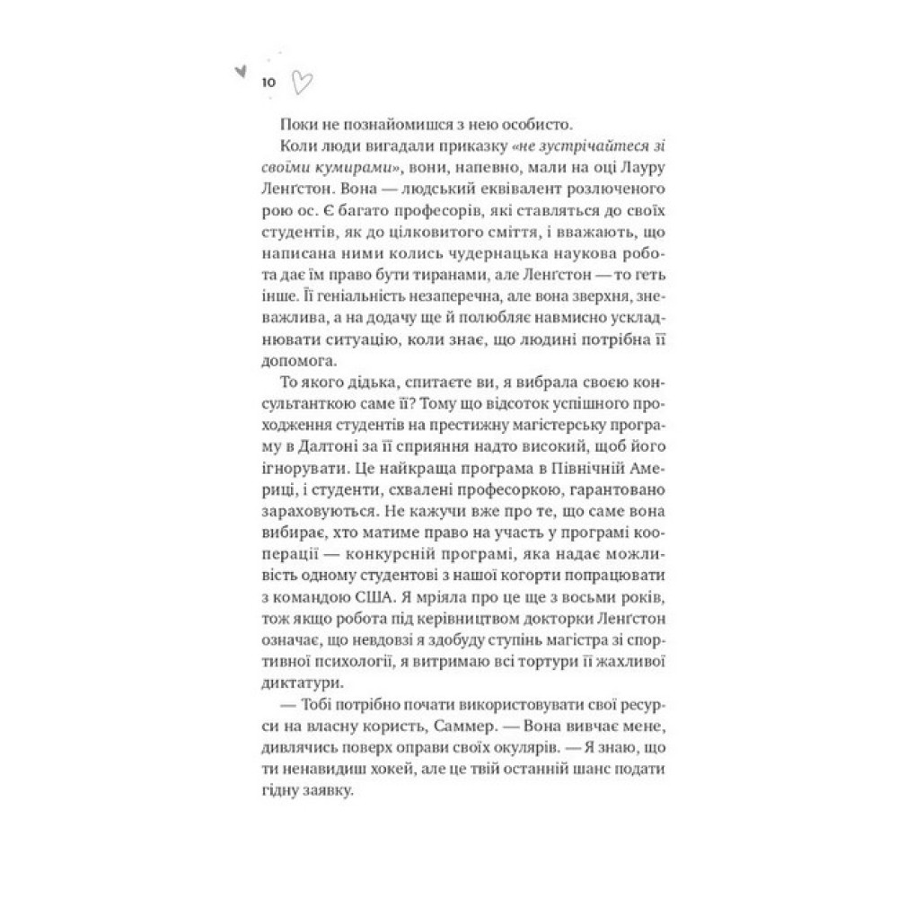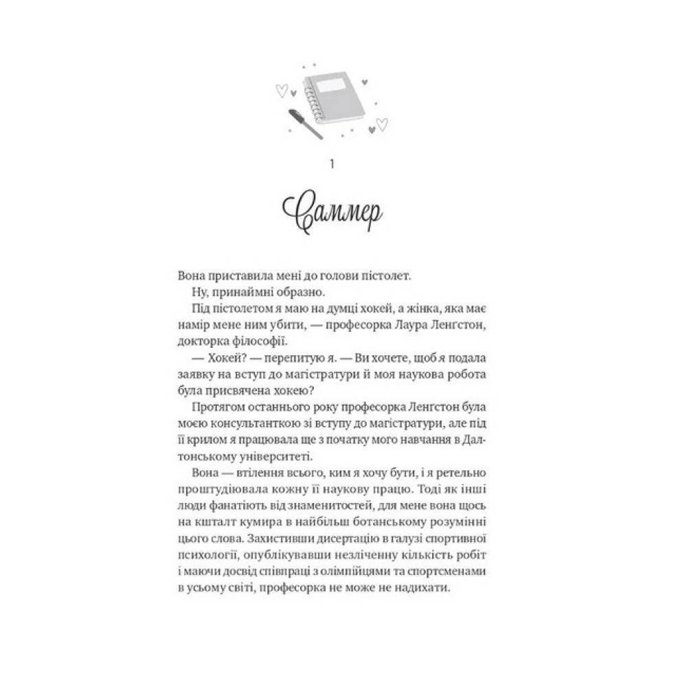 Саммер Престон — відмінниця з амбітними планами. Вона мріє стати спортивною психологинею та вступити до аспірантури. Для цього дівчині потрібно зробити хокей темою дослідження. Саммер ненавидить цю гру, однак наукова консультантка ставить перед нею ультиматум: або вона долає своє упередження, або втрачає місце в аспірантурі. Тим часом необачна помилка капітана хокейної команди Ейдена Кроуфорда ставить під загрозу весь сезон. Тому тренер придумує для нього справжнє покарання: хлопець стане головним об’єктом дослідження Саммер. Це — останнє, що він хотів би робити, тим паче що дослідниця неначе готова пожбурити в нього ковзанами. Та й сам Ейден цілковито підтверджує найгірші припущення Саммер про хокеїстів — думає лише про гру, запальний, безцеремонний. Їм доведеться терпіти одне одного, допоки пристрасть між ними не розтопить лід.