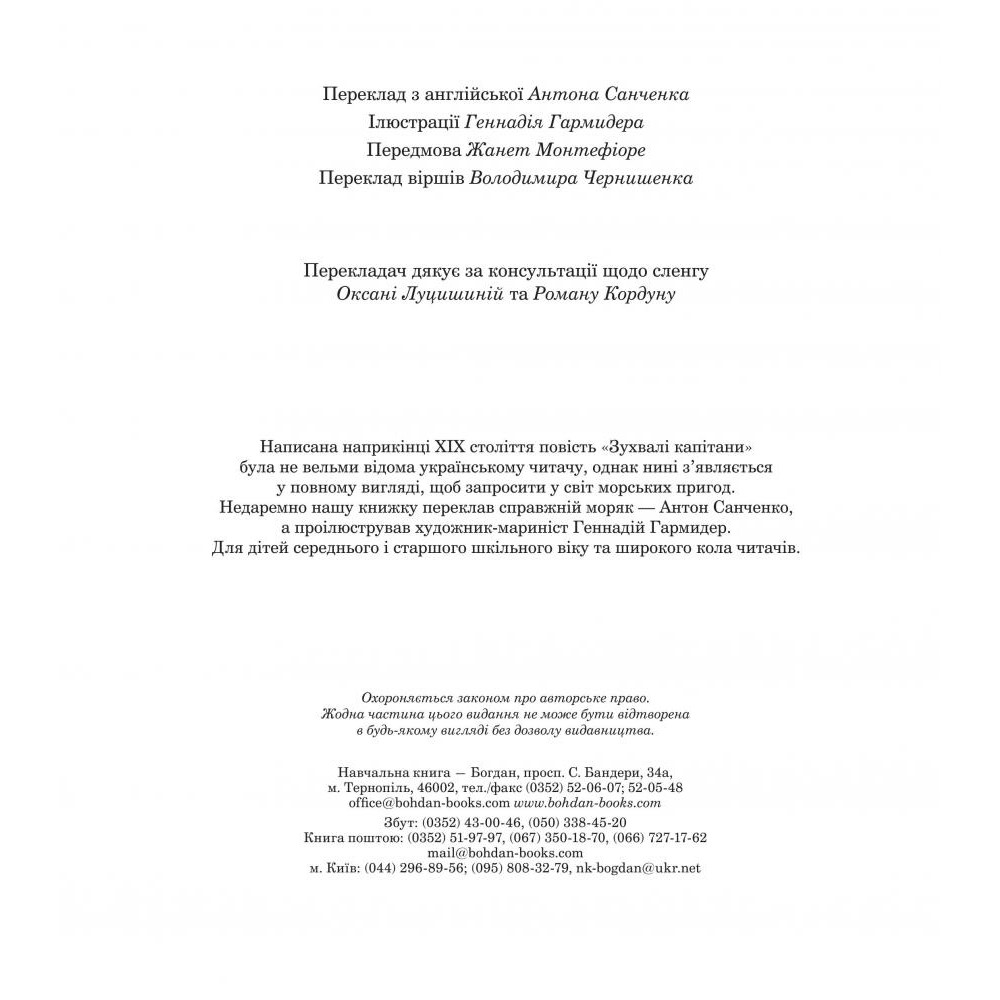 Написана наприкінці ХІХ століття повість «Зухвалі капітани» була не вельми відома українському читачу, однак нині з’являється у повному вигляді, щоб запросити у світ морських пригод. Недаремно нашу книжку переклав справжній моряк — Антон Санченко, а проілюстрував художник-мариніст Геннадій Гармидер. Для дітей середнього і старшого шкільного віку та широкого кола читачів.