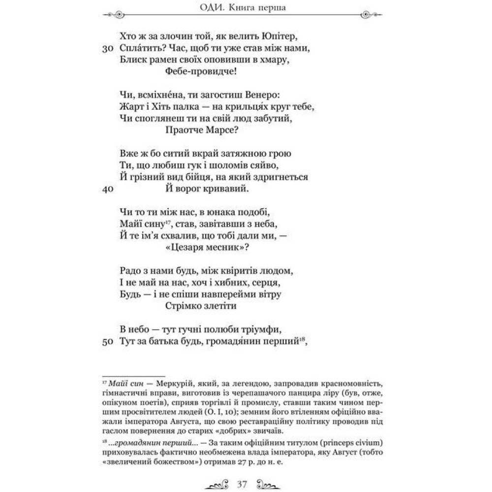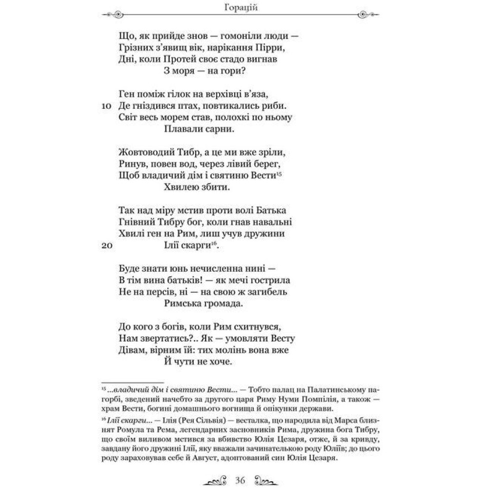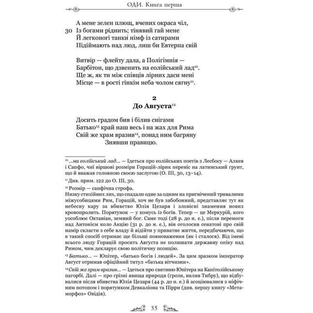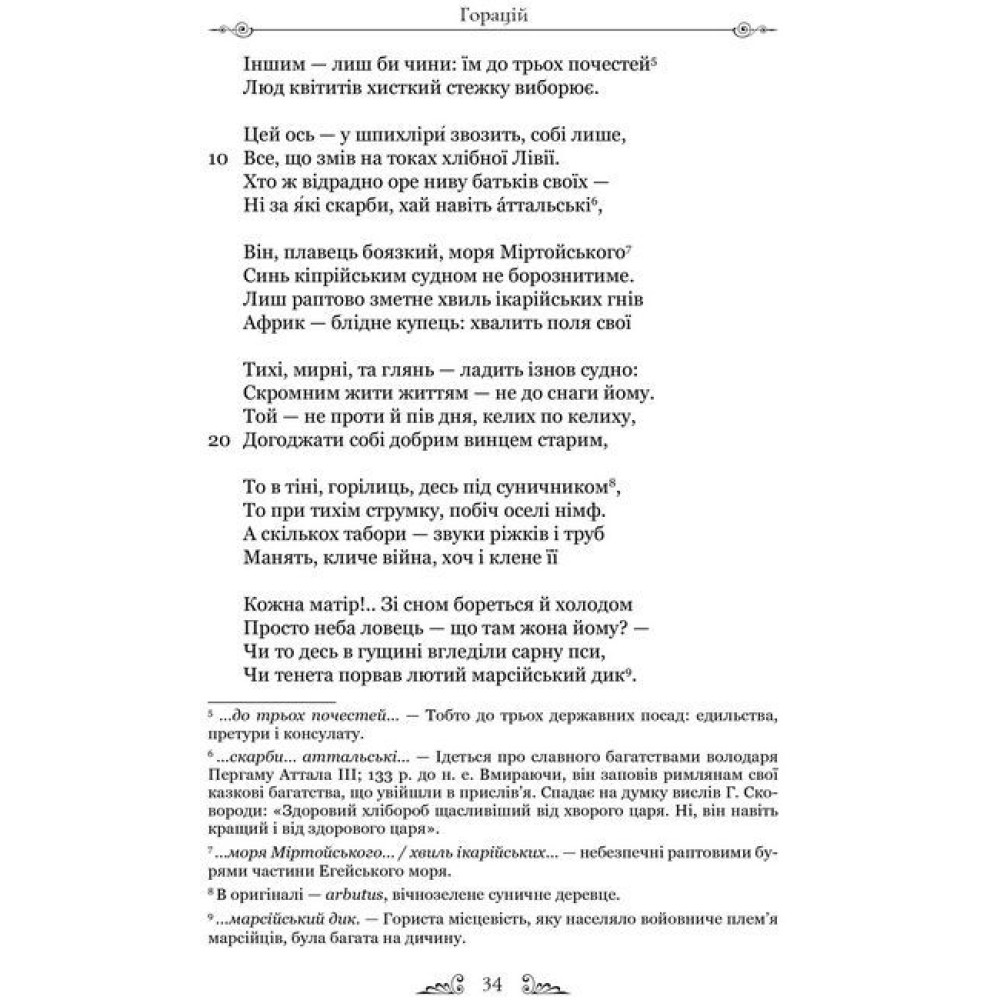 Славетний, «багатий ритмами» лірик, автор колоритних «Сатир» та філософських «Послань» Квінт Горацій Флакк (65–8 рр. до н.е.) залишив унікальну своїм розмаїттям поетичну мозаїку життя, що барвами й тонами живо перегукується з реаліями нашої доби. Перейнятий ідеями волелюбних еллінів співець рівноваги духу та душевної погоди є найяскравішим виразником усієї греко-римської культури. Чуттєвий і віртуозний лірик, сумовито всміхнений мислитель і теоретик поезії, він справив колосальний вплив на європейську, в тому й українську, культуру. «Я — людина, й ніщо людське не чуже мені», — словами Теренція з повним правом міг би сказати про себе й Горацій; тим він цікавий і близький читачеві всіх часів.Оновлений, повний, розлого коментований переклад творів Горація українською мовою видається вперше.