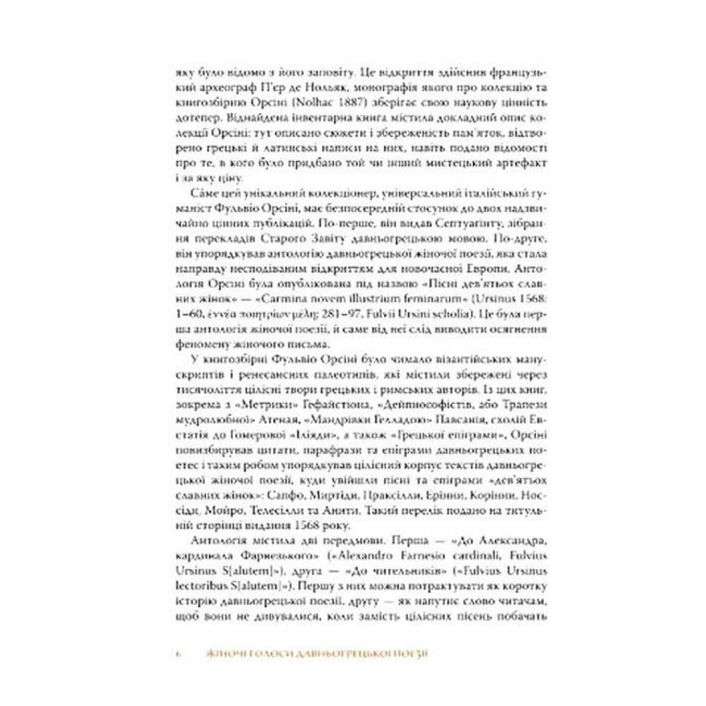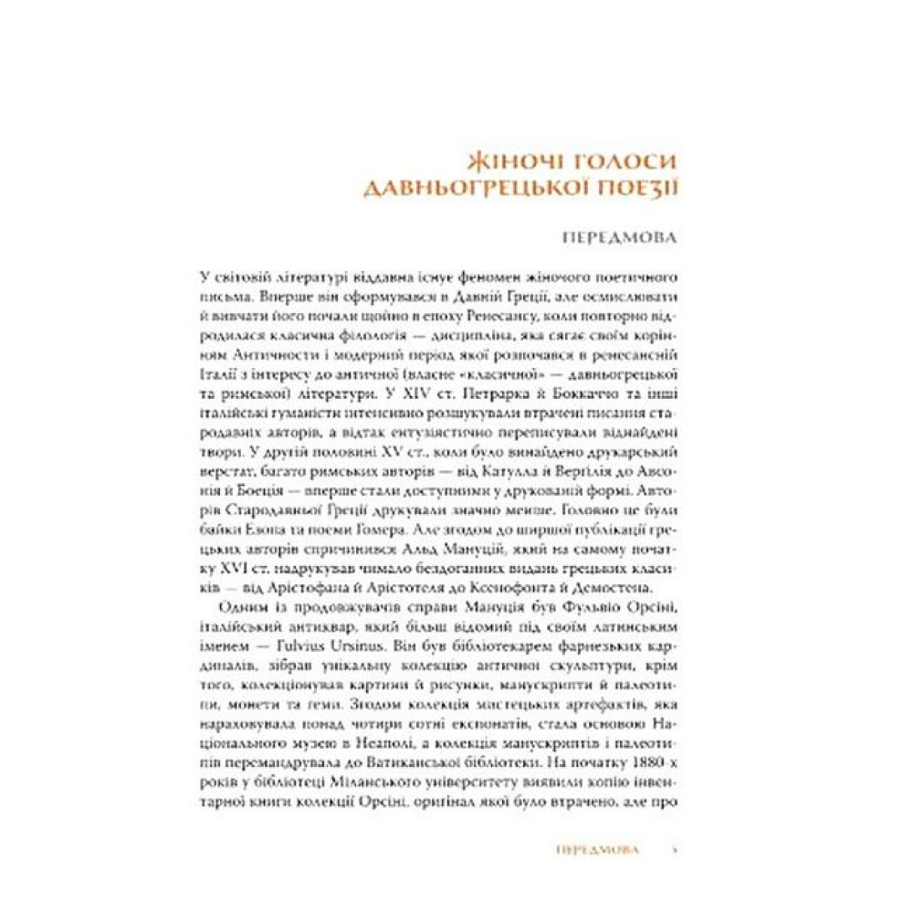 Феномен жіночого поетичного письма вперше сформувався в Давній Греції. Александрійські книжники уклали «канон грецьких поетес»: Сапфо, Миртіда, Телесілла, Праксілла, Корінна, Ерінна, Анита, Носсіда й Мойро (поетеси VII–III ст. до Хр.). Але були поетеси й поза каноном: Гедила, Філінна, Мелінно, Юлія Бальбілла, Кайкілія Требулла, Дамо, Клеопатра, Теосебея й Евдокія Авґуста (поетеси III ст. до Хр. – V ст. після Хр.). Ці «канонічні» й «неканонічні» поетеси увійшли в «Кодекс давньогрецької жіночої поезії» — перше повне видання їхніх поетичних творів у перекладах українською мовою. Тут упорядковано та прокоментовано понад 350 текстів (фраґментів) жіночої поезії — від Сапфо до Евдокії Авґусти, від жриці до імператриці. Кодекс, як сукупність цілісних корпусів текстів кожної поетеси, сформовано з класичних антологій давньогрецької поезії, які суттєво доповнені новітніми публікаціями — текстологічними, епіграфічними та папірологічними.