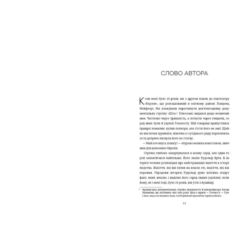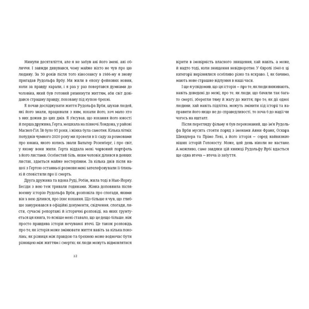 Квітень 1944-го.В’язень Аушвіцу, дев’ятнадцятилітній Вальтер Розенберг (який згодом змінить ім’я на Рудольф Врба), за кілька попередніх років уже зіткнувся з усіма звірствами табору смерті: газовими камерами, крематоріями та жорстокістю охорони. Одного разу йому доручили перевірити речі нових в’язнів: жінок, чоловіків, дітей, цілих сімей... Зрозумівши, що ці речі ніколи не знадобляться власникам, оскільки їх стратили відразу після того, як вони потрапили до табору, хлопця охопив жах. Він вирішив діяти. Його метою стала втеча, проте не тільки задля власного порятунку, а й щоб відкрити світові правду про Аушвіц та попередити решту євреїв про те, яка доля чекає на них у кінці залізничної колії. Юнак розпочав свою підготовку й запам’ятав усі звичаї та розпорядки концтабору. Він використовував цю інформацію для втечі та створення детального звіту, яким можна поділитися зі світом. Незважаючи на всі труднощі: засніжені поля, крижані річки й насторожені села, Вальтер і його товариш-втікач, Фред Ветцлер, все ж доставили перший звіт про Аушвіц з інформацією про жахіття, які чинили над невинними людьми.Та чи готовий був світ, осліплений війною, почути правду?Це історія про боротьбу за людську гідність і справедливість. Про те, як юний хлопець намагався протистояти бездушній машині знищення. Це також дослідження людської природи, що показує, як складно світові чути правду про страшні події, особливо коли ця правда є незручною або шокуючою.Про автора:Джонатан Фрідленд — британський журналіст, письменник, драматург і борець за правду. Народився письменник 1967 року в Лондоні. Працює в газеті The Guardian з 1993 року, де веде щотижневу колонку про сучасну історію. Джонатан є автором дванадцяти книг, серед яких: «The Escape Artist: The Man Who Broke Out of Auschwitz to Warn the World» («Майстер утечі. Людина, яка втекла з Аушвіцу, щоб попередити світ»), що увійшла до короткого списку «Книги року Waterstones». «The Big Lie: Exposing the Nazi War Machine» («Велика брехня: викриття нацистської військової машини») та «The Secret Lives of Spies» («Таємне життя шпигунів»).Письменник став лауреатом численних нагород, зокрема премії «Крістофер» за журналістику в галузі міжнародної політики (2018), премії «Дейвід Лівінгстон» за журналістику в галузі єврейської тематики (2014) і премії «Сідней Шелдон» за журналістику в галузі прав людини (2013).Фрідленд є активістом за права людини й висловлює свою підтримку низці організацій, з-поміж них і Міжнародному кримінальному суду (Amnesty International і Human Rights Watch).