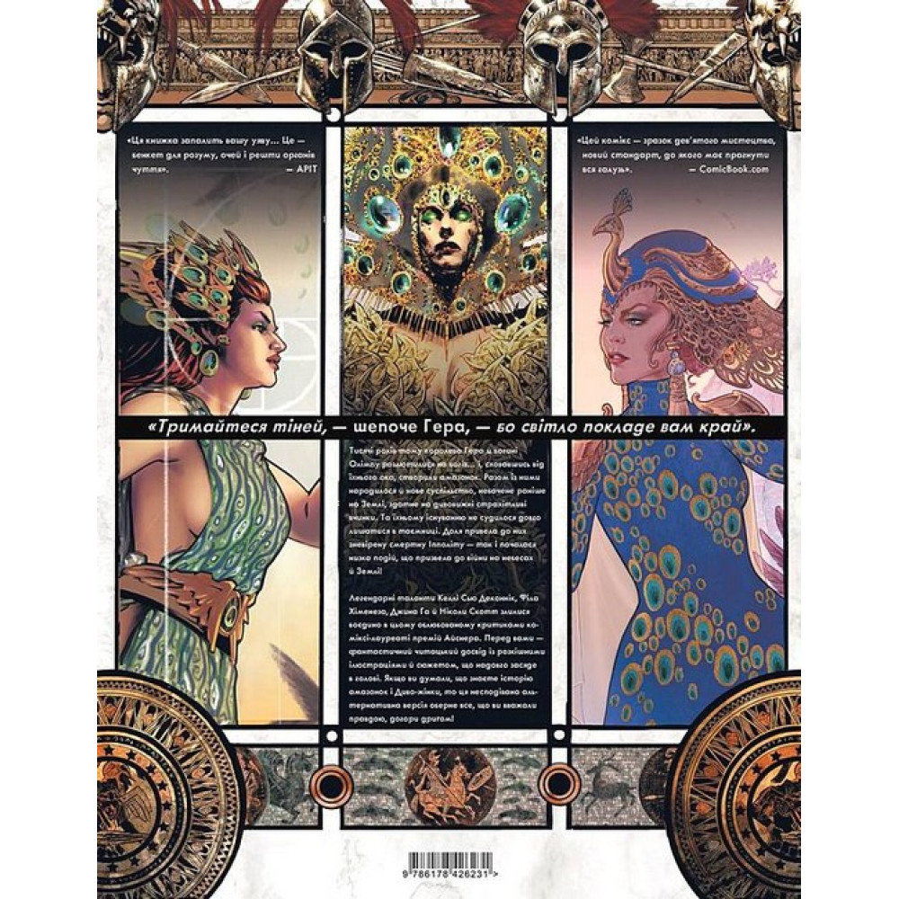 «Тримайтеся тіней, — шепоче Гера, — бо світло покладе вам край». Тисячі років тому королева Гера й богині Олімпу розлютилися на богів… і, сховавшись від їхнього ока, створили амазонок. Разом із ними народилося й нове суспільство, небачене раніше на Землі, здатне на дивовижні страхітливі вчинки. Та їхньому існуванню не судилося довго лишатися в таємниці. Доля привела до них зневірену смертну Іпполіту — так і почалася низка подій, що призвела до війни на небесах й Землі! Легендарні таланти Келлі Сью Деконнік, Філа Хіменеза, Джина Га й Ніколи Скотт злилися воєдино в цьому облюбованому критиками коміксі-лауреаті премій Айснера. Перед вами — фантастичний читацький досвід із розкішними ілюстраціями й сюжетом, що надовго засяде в голові. Якщо ви думали, що знаєте історію амазонок і Диво-жінки, то ця несподівана альтернативна версія оберне все, що ви вважали правдою, догори дриґом!