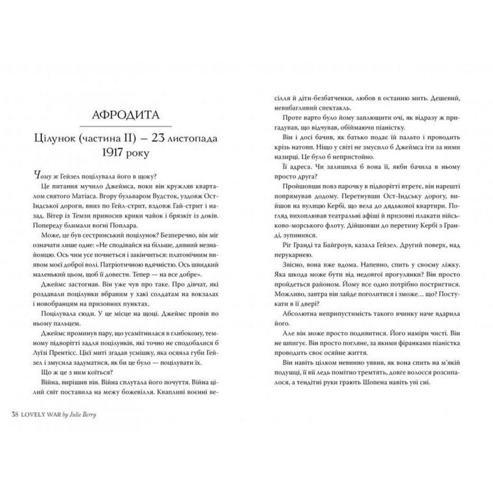 Їх четверо — Гейзел, Джеймс, Обрі та Колетт. Талановита піаністка з Лондона; хлопець, що мріє стати архітектором, та натомість потрапляє на фронт; король регтайму й імператор джазу та бельгійська сирота з неймовірним голосом, душевні рани якої ще не скоро загояться… Їхню історію переповідає богиня Афродита — історію, сповнену викликів, втрат, сподівань, горя та пристрасті. Життя цих абсолютно різних і водночас схожих людей стверждує головну істину — якою могутньою стихією не була б війна, їй не зрівнятися з цілющою силою справжньої любові.