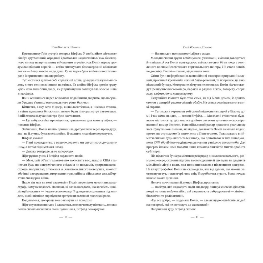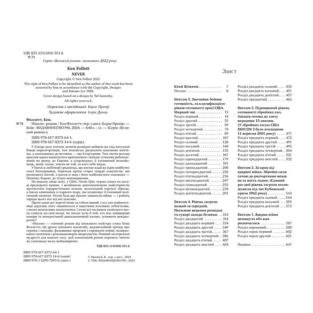 У Сахарі двоє елітних агентів розвідки вийшли на слід потужної банди наркоторгівців, тож повсякчас ризикують власними життями, а закохавшись до нестями, — ще й кар’єрами. Тим часом молода красуня-вдова намагається врятуватися з полону сучасних рабовласників на шляху до Європи, а супроводжує її таємничий незнайомець, який, схоже, зовсім не той, за кого себе видає. У Китаї ж амбітний урядовець, що плекає надії на гідне майбутнє своєї батьківщини, бореться проти старої гвардії комуністів, які штовхають Китай, а разом із ним і його найближчого союзника — Північну Корею, до точки неповернення. На іншому кінці світу, у США, Полін Ґрін, перша жінка на посаді президента країни, з неабиякою дипломатичною майстерністю протистоїть терористичним атакам, нелегальній торгівлі зброєю, а також кампаніям із чорного піару, які влаштовує її головний політичний опонент. Полін будь-що прагне уникнути війни — і робить заради цього все від неї залежне. Проте один акт агресії тягне за собою інший, і ось уже наймогутніші держави світу опиняються в павутинні взаємних зобов’язань, з якого неможливо виплутатися. І коли всі частинки зловісного пазла стануть на свої місця, чи зможе хоча б той, хто має найщиріші наміри та непересічний дипломатичний талант, зупинити невідворотне? «Ніколи» — епічний роман від визнаного майстра слова Кена Фоллетта. Це драма світового масштабу, надзвичайний трилер про героїнь і лиходіїв, фальшивих пророків і справжніх воїнів, поміркованих політиків і революціонерів-опортуністів. Повний застережної мудрості для нашого часу, цей захопливий роман перенесе читача на самісіньку межу неймовірного.