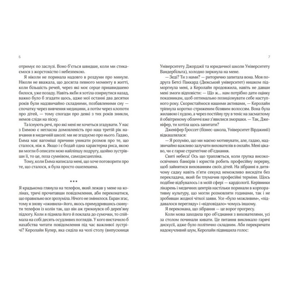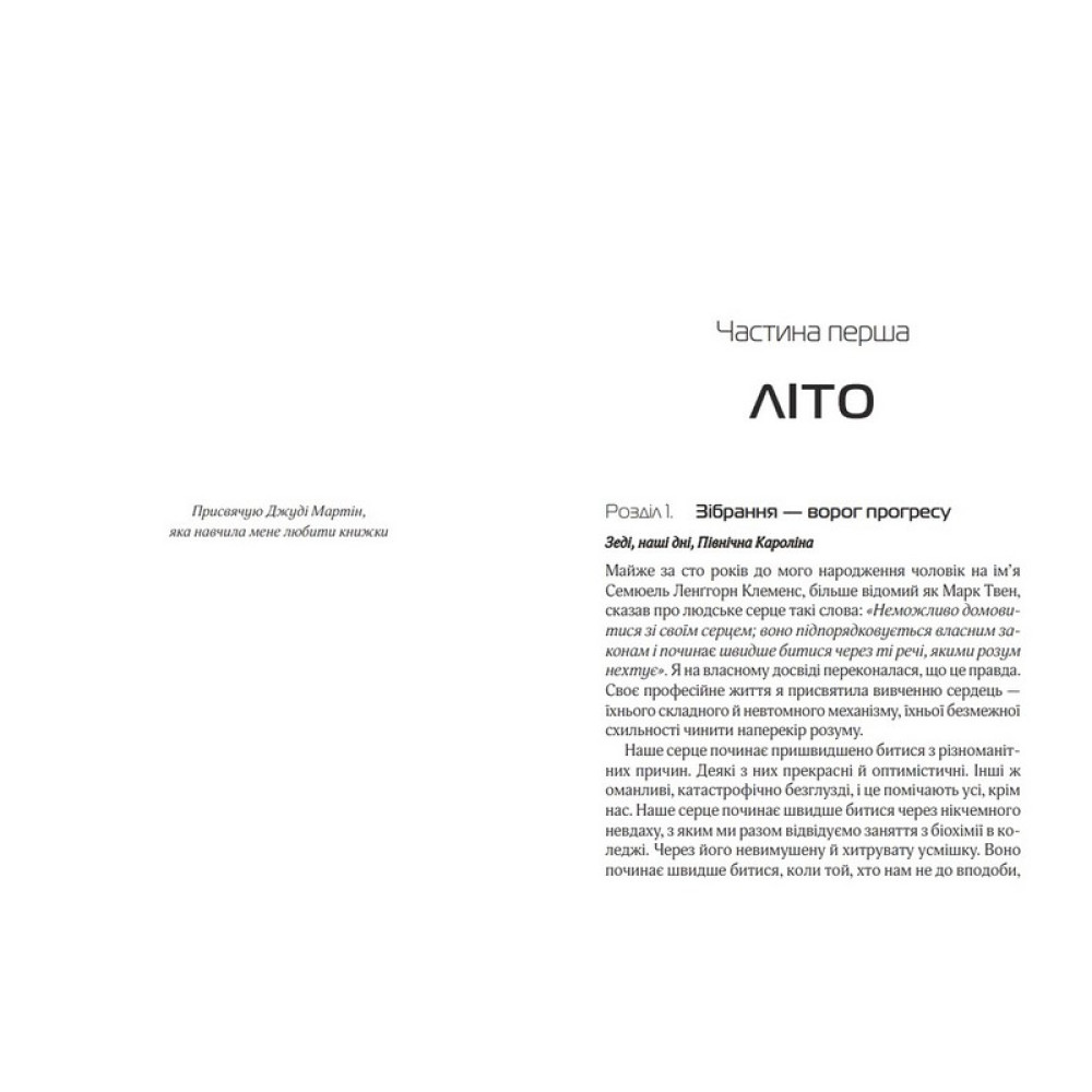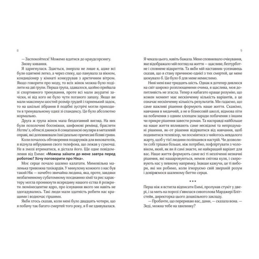 Серце людини пришвидшено б’ється з різноманітних причин. Деякі з них прекрасні й оптимістичні. Інші ж оманливі й безглузді, і це помічають усі, окрім нас. Та що може змусити забитися частіше серце лікарки-кардіолога? Зеді гадала, що за майже двадцять років дружби вона знає геть усе про подругу Емму. Пам’ятає кожен день навчання в медичній школі, дівочі переживання й нічні теревені. У минулому вони добре знали одна одну. Занадто добре. Одначе тепер, коли в їхнє життя повернувся Нік, колишній наставник, усе змінилося. Його поява нагадала Еммі про те жахіття, що сталося з ними в роки навчання, про те, що мало не зруйнувало життя обох подруг. У присутності Ніка серце Емми, здається, аж вистрибує з грудей. Від щастя чи, може, від страху?..