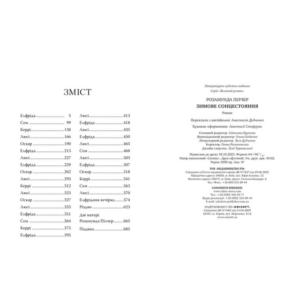 Елфріда, колишня акторка, переїжджає в селище Дібтон, подалі від міського галасу — і сподівається почати життя з чистого аркуша. Вона швидко звикає до сільських буднів, а місцеві мешканці вже звертаються до неї на «ти», однак попри все жінка почувається самотньою… Оскар кинув кар’єру музиканта в Лондоні, щоб одружитися із Ґлорією. Подружжя виховує доньку Франческу, і Оскар певен — щастя батьківства вартує будь-якої жертви. Керрі повертається додому з Австрії після невдалого роману з одруженим чоловіком і виявляє, що її мати й сестра так і не можуть дійти згоди. Наближається Різдво, і Керрі забирає до себе племінницю Люсі — тиху чотирнадцятирічну дівчинку, аби подарувати їй справжнє свято. Сем намагається жити далі після розставання з дружиною, яка кинула його заради іншого. Єдине, що залишилося в Сема, — робота. Вона й приводить чоловіка на північ Шотландії, і вже скоро він розуміє, що хоче залишитися тут назавжди. Долі цих людей перетнуться у маєтку в Крейґані — мальовничому шотландському містечку — в найкоротший день року. Перетнуться, щоб змінитися назавжди. «Зимове сонцестояння» Розамунди Пілчер — роман про любов, вірність і зцілення зболених душ.