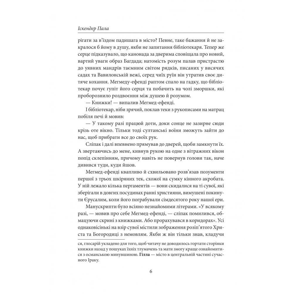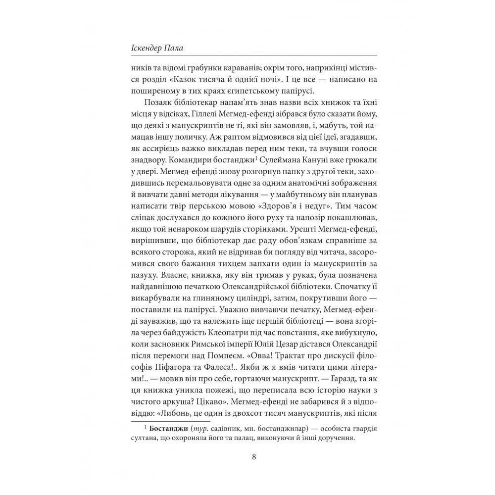 Іскендер Пала (нар. 1958 р.) — письменник-енциклопедист, одна з мегазірок турецької словесності ХХІ століття. Його твори перекладено десятками мов світу, їх шаленими накладами перевидають і в Європі, і в Азії. Прискіпливий читач знайде в його романах геть усе: від мариністичних подробиць до назв близькосхідного посуду. Автор, як професійний історик літератури, пересипає їх і неймовірними оповідями про минуле, котрі черпає з давніх рукописів та хронік.