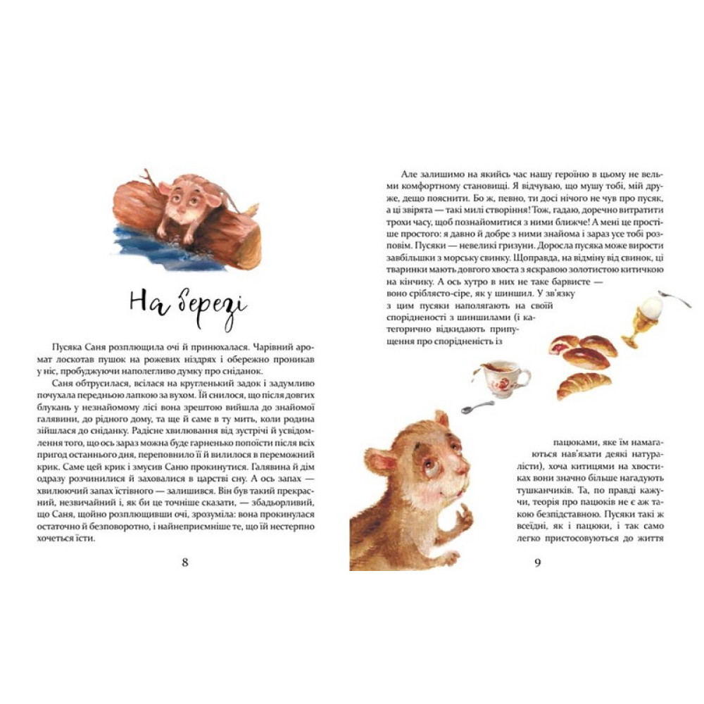 Звісно ж, лапландської мови не існує, а казкову повість «Пригоди пусяки Сані» насправді створила українська письменниця Тамара Нестеренко. Псевдонім зі «скандинавським» звучанням — це данина поваги авторки чудовим казкаркамАстрід Ліндгрен, Туве Янссон та Сельмі Лагерлеф. Таких маленьких літературних жартів у тексті буде чимало.Пусяки — казкові гризуни, трохи сході на шиншил. Ці створіння милі, миролюбні й понад усе цінують родинне тепло та затишок. Можливо, саме через це пусяки цураються пацюків і навіть принципово не їдять сиру — улюблених щурячих ласощів.Одного дня маленька пусяка Саня загубилася у величезному лісі. Уперше лягла спати без склянки какао й поцілунку на добраніч. Уперше залишилась без булочок із корицею на сніданок і жвавих розмов за столом.А навкруги — хащі, повні небезпек.Куди йти, що їсти, як захиститися від хижаків?Чудові пахощі якогось невідомого смаколика привели пусяку до річки, де вона натрапила на... пацючку зі шматком сиру. Що ж Сані робити: залишитися самотньою й голодною чи порушити відразу дві заборони? Есмеральда — життєрадісна корабельна пацючка, справжнісінька морська вовчиця. Вона побувала в далеких країнах, перечитала багато книжок, пережила безліч карколомних пригод і навіть кораблетрощу, яка й звела її з маленькою пусякою. Хто б зміг краще за Есмеральду захистити Саню, навчити добувати їжу в лісі, застерегти від отруйних рослин і небезпених тварин та поділитися з нею мудрістю.