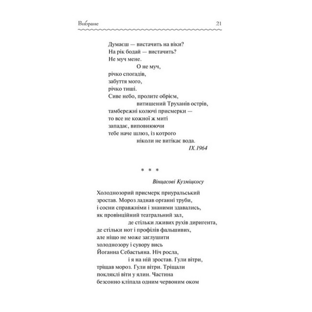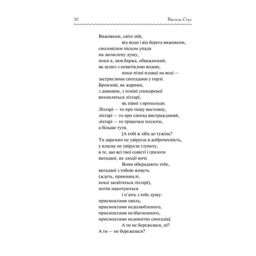 «Долі не обирають... Її приймають — яка вона вже не є». Василь Стус не лише поет рідкісного таланту, публіцист, перекладач і літературознавець — це людина, яка уособила «голос сумління у світі розхитаних і розмитих понять честі, правди, порядності». Майже половину свого життя Василь Стус провів у радянських слідчих ізоляторах, карцерах, камерах-одиночках, мордовських таборах, на Колимі, на каторжній роботі в шахті. Його позбавляли побачень з рідними, вилучали вірші, листи й рукописи, знущалися фізично й намагалися знищити морально. Поезії, що увійшли до цієї збірки, — найкращі зразки лірики Василя Стуса. У цих рядках громадянські мотиви та біль митця за долю України переплітаються з тонким мереживом любовної лірики і філософськими роздумами про життя й призначення людини. Вірші сповнені надії та сили волі, міцнішої за крицю.