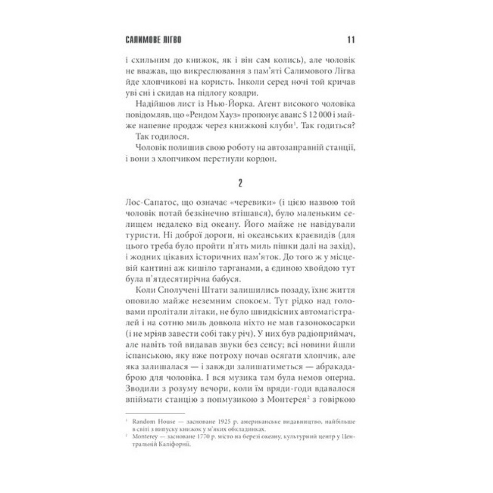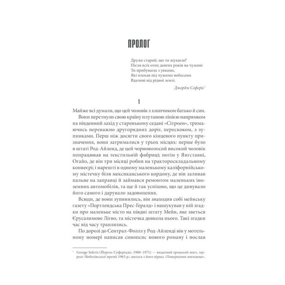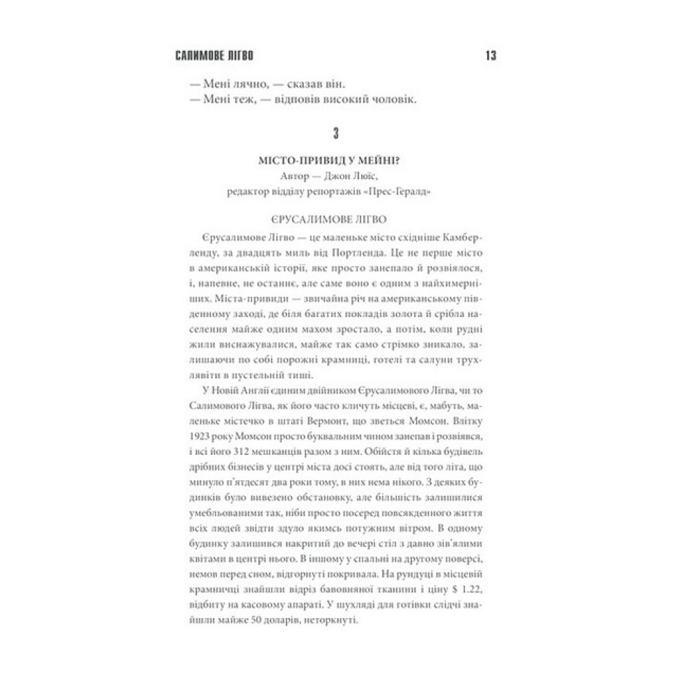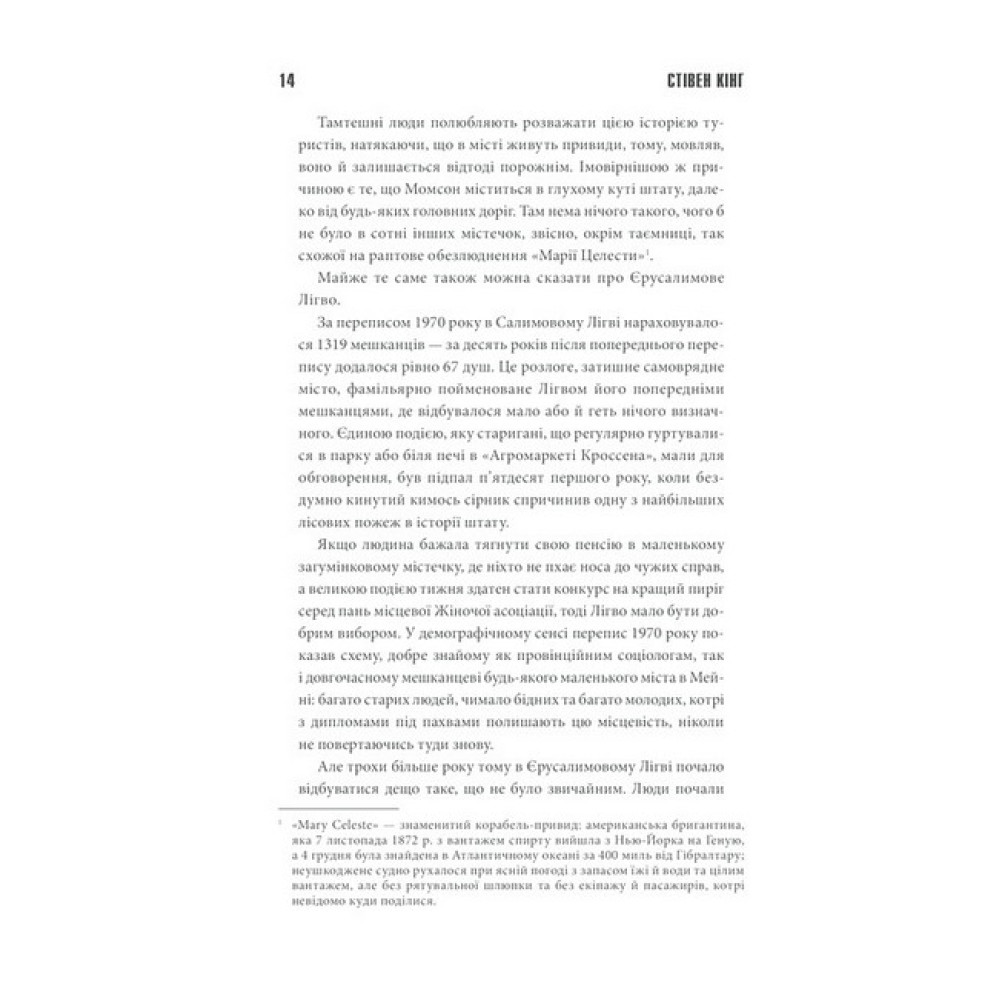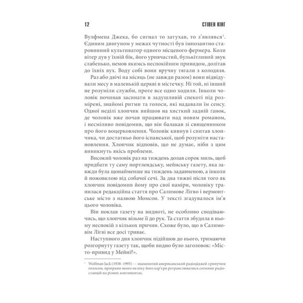 Стівен Кінг — неймовірно популярний американський письменник, який може похизуватися тим, що майже кожен його твір стає літературною сенсацією та стовідсотковим бестселером. За понад 40 років творчої діяльності Кінга світ побачило безліч романів, наклади яких давно перетнули межу в третину мільярда примірників. Він володар численних престижних літературних нагород і має чималу армію шанувальників, яка незмінно поповнюється. Містечко, у якому виріс Бен Міерз, завжди було звичайним. Нічого особливого, нікого особливого, хіба що назва трохи дивна: Єрусалимове, або, як вимовляють місцеві люди, Салимове Лігво. І ось Бен, тепер уже відомий письменник, повернувся сюди знову, бо хотів закрити гештальт минулого — свій дитячий страх. Те, що він малим побачив у старому зруйнованому будинку, який називали Домом Марстена, ледь не довело його до божевілля. Та Салимове Лігво не квапиться стирати старі спогади Бена. Навпаки: над Домом Марстена скупчуються моторошні хмари. У містечку один за одним зникають люди. Та найстрашніше розпочнеться тоді, коли зниклі знову повертатимуться…