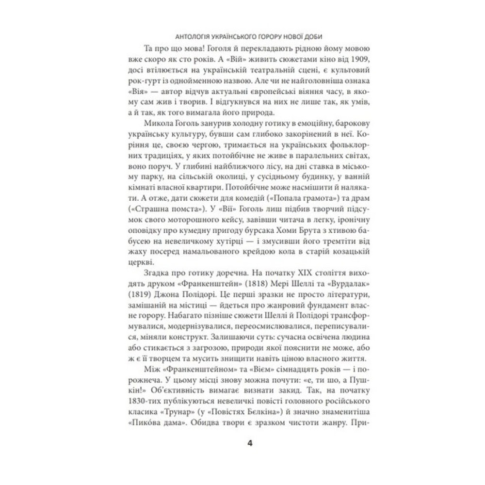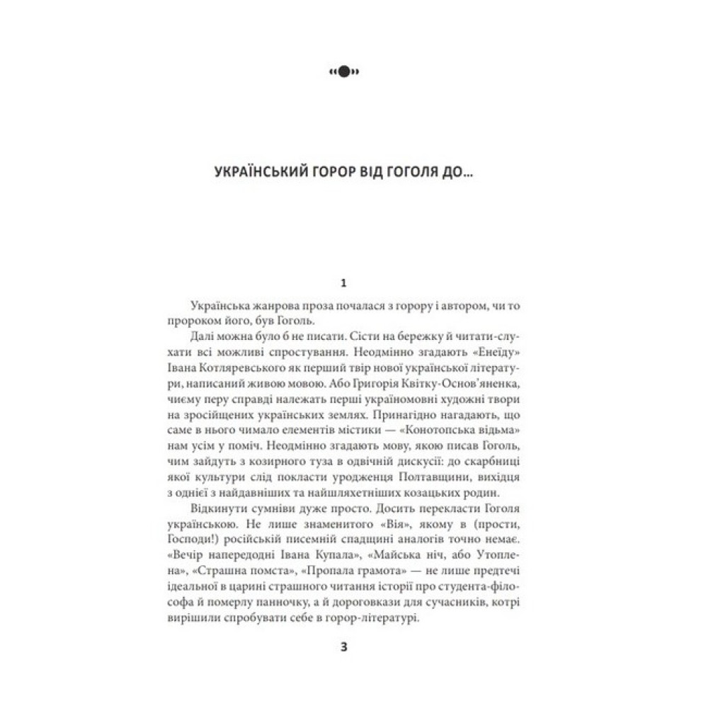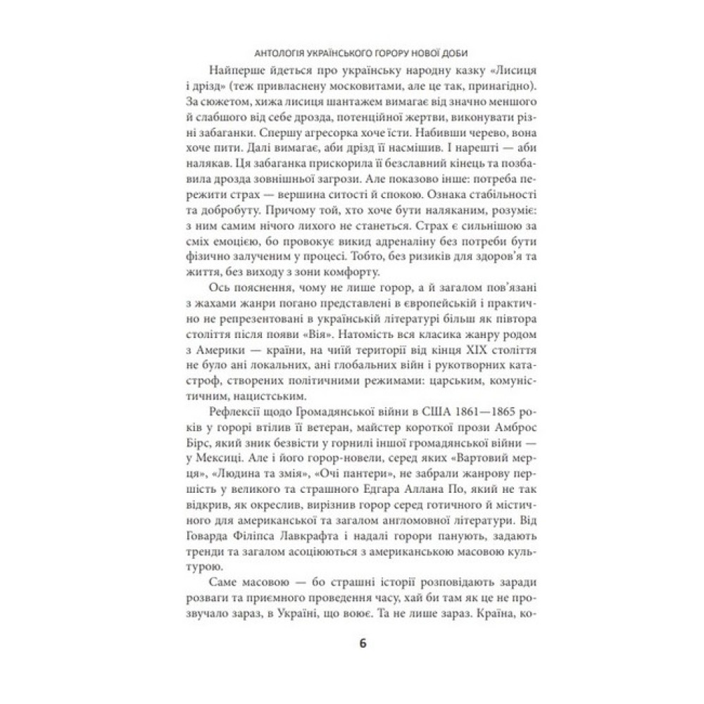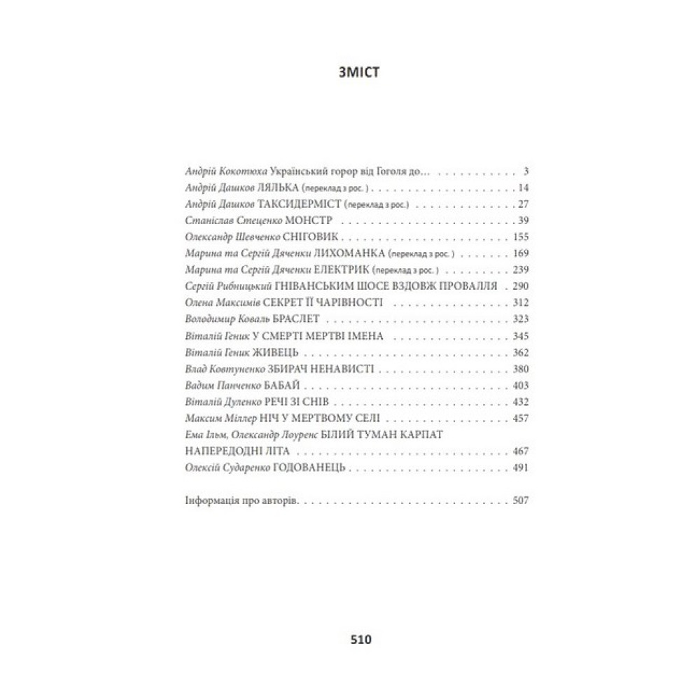До першої антології українського горору увійшли новели сучасних українських письменників Андрія Дашкова, Станіслава Стеценка, Олександра Шевченка, Марини та Сергія Дяченків, Сергія Рибницького, Олени Максимів, Володимира Коваля та ін. Укладач збірки Андрій Кокотюха вважає, що український горор має глибоке коріння в українських фолькльорних традиціях, а першим автором у цьому жанрі був нащадок козацького роду Микола Гоголь. В українському фольклорі потойбічне не живе в паралельних світах, воно поруч: у глибині найближчого лісу, на дні ставка в міському парку, на сільській околиці, в сусідньому будинку, у ванній кімнаті власної квартири. Поціновувачі жанру знайдуть в книзі історії на різний смак: тут є і маніяки-вбивці, й моторошні дитячі іграшки, живі мерці й смертельні віруси.