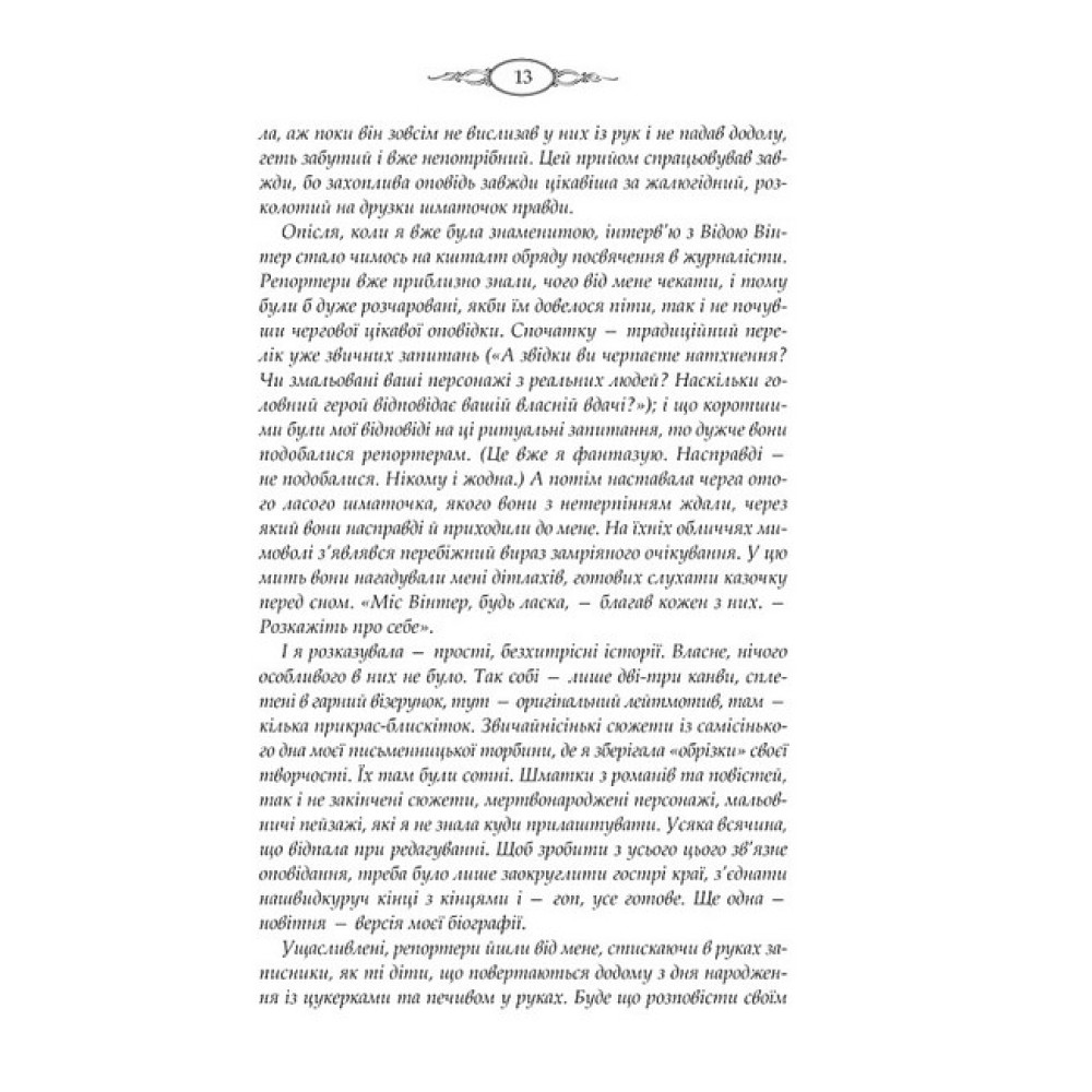 Минуле Віди Вінтер, відомої письменниці, довгі роки залишалося загадкою для читачів і журналістів: численні версії своєї біографії вона легко і переконливо вигадує сама. Проте поважний вік і хвороба спонукають її нарешті розповісти правду. Записати свою справжню історію Віда пропонує Маргарет Лі. Чому вибір Віди впав саме на цю аматорку в жанрі біографії, у житті якої до того ж немає нічого незвичайного, крім однієї деталі?..Тим не менш Маргарет приїздить у старовинний маєток Вінтер, де за кожними дверима прихована таємниця. Вона з головою поринає у чужі сімейні секрети. Але хто знає, чи не зустріне вона в коридорах старого будинку свого власного привида?