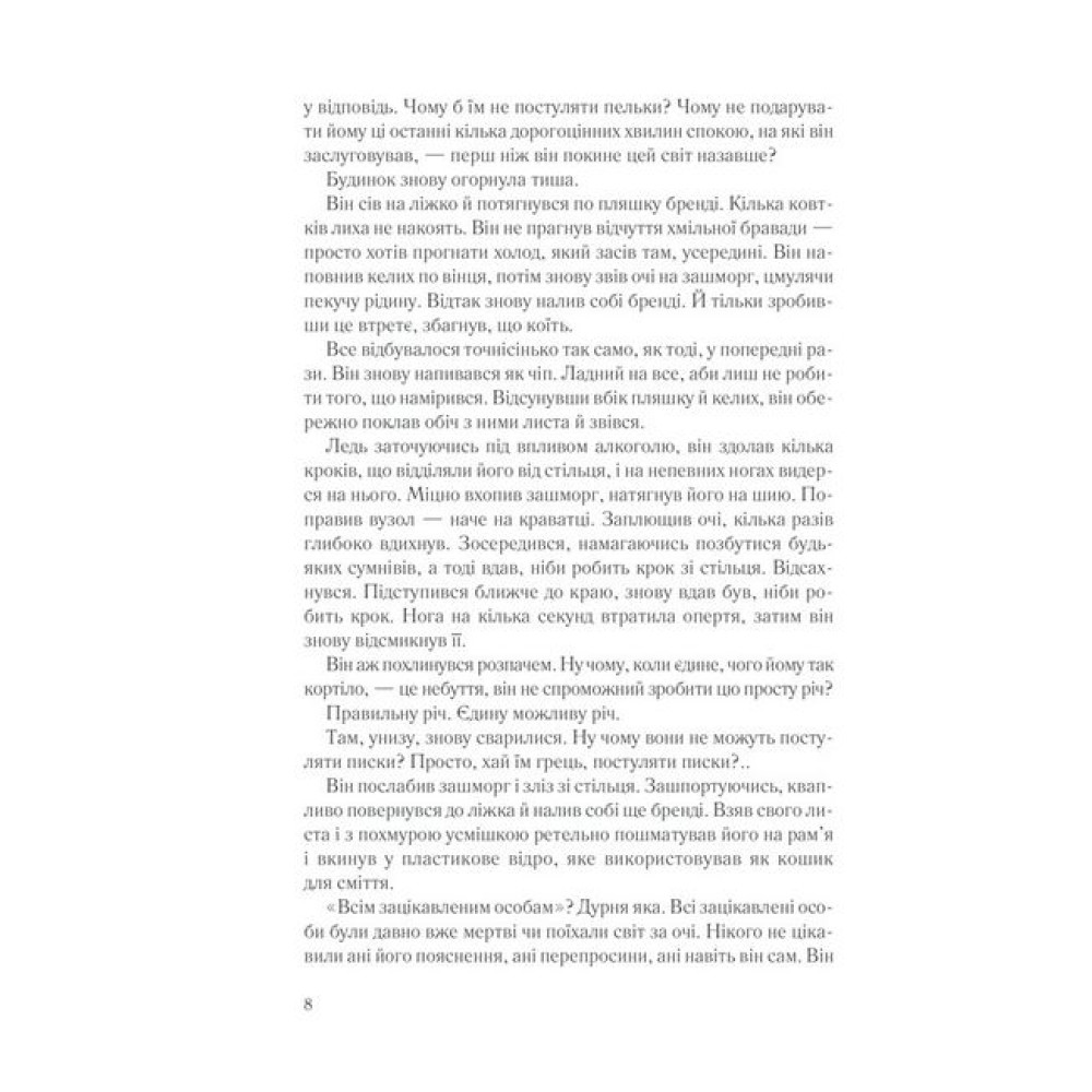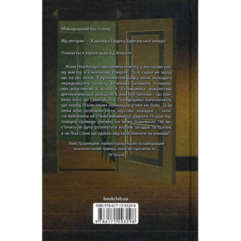 Міжнародний бестселерВід авторки — Кавалера Ордену Британської імперіїПланується екранізація від AmazonКоли Ліза Кендал винайняла кімнату у вікторіанському маєтку в Північному Лондоні, то й гадки не мала, що на неї чекає. У приліжковій шафці вона знаходить передсмертну записку, вочевидь залишену попереднім власником її кімнати. Стривожена відкриттям, дівчина вирішує довідатися, ким був чоловік і що привело його до самогубства. Орендодавці наполягають, що перед Лізою інших пожильців у них не було. Та їм нема віри — особливо після чергової знахідки: записів небіжчика на стінах винайнятої кімнати. Пошук відповідей приведе дівчину на межу божевілля. Чи стане їй духу розплутати клубок загадок та брехні і дізнатися правду, а чи Ліза стане ще однією жертвою кімнати на винайм?..