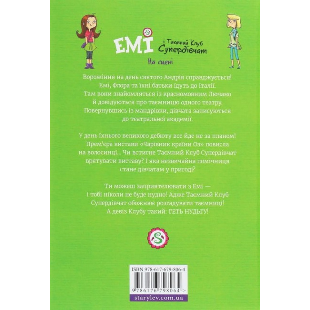 «Емі і Таємний Клуб Супердівчат. На сцені» — третя книжка з серії польської письменниці Агнєшки Мєлех про допитливу дівчинку, яка обожнює таємниці.Ворожіння на день святого Андрія справджується! Емі, Флора та їхні батьки їдуть до Італії. Там вони знайомляться із красномовним Лючано й довідуються про таємницю одного театру. Повернувшись із мандрівки, дівчата записуються до театральної академії.У день їхнього великого дебюту все йде не за планом! Прем’єра вистави «Чарівник країни Оз» повисла на волосинці… Чи встигне Таємний Клуб Супердівчат врятувати виставу? І яка незвичайна помічниця стане дівчатам у пригоді?