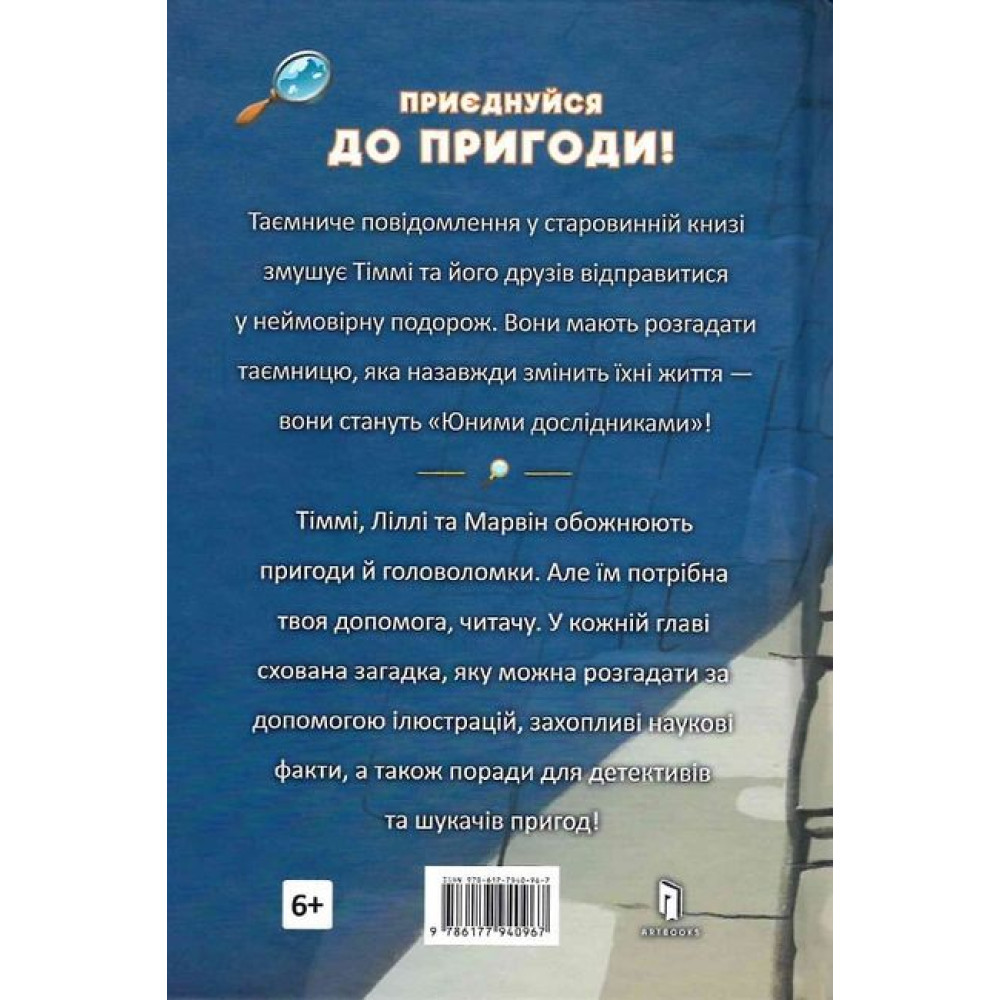 Таємниче повідомлення у старовинній книзі змушує Тіммі та його друзів відправитися у неймовірну подорож. Вони мають розгадати таємницю, яка назавжди змінить їхні життя — вони стануть «Юними дослідниками»!• Це пригодницька історія з яскравими ілюстраціями, що мають не лише декоративну функцію — на них заховані підказки до загадок, які читач розгадуватиме разом із головними героями.• У кінці книжки міститься добірка цікавих енциклопедичних фактів, а також практичні завдання! Маленький детектив навчиться знімати відбитки пальців, а для шукачів пригод тут розміщено інструкцію, як опріснювати морську воду.Єнс І. Ваґнер — автор кількох пригодницьких серій для дітей. Його книжки «Легенда «Зореплавця» та «Спадок винахідника» розраховані на читачів середнього шкільного віку, а «Родинна таємниця», «Загублене намисто», «Тінь і золота кімната» — для молодших дітлахів.