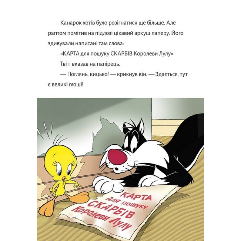 За мотивами мультфільмів Looney Tunes! На кораблі гаркавий канарок Твіті з хитрим котиськом Сильвестром знаходять карту скарбів. Вони одразу будують плани, як витрачатимуть свої мільйони. Але чи буде скарб саме таким, на який очікують напарники? Ця детективна пригода відкриє їм очі на найцінніші речі в житті. Чому варто придбати:Всесвітньо відомі персонажі заговорили українською на сторінках цієї книжки!Комфортний текст для перших самостійних кроків у читанні.Малий милий птах показує, наскільки цінними є розум та спостережливість.Разом із Твіті подорожуй світом і відкривай нове.Детективний сюжет захоплює, а розв’язка дивує!