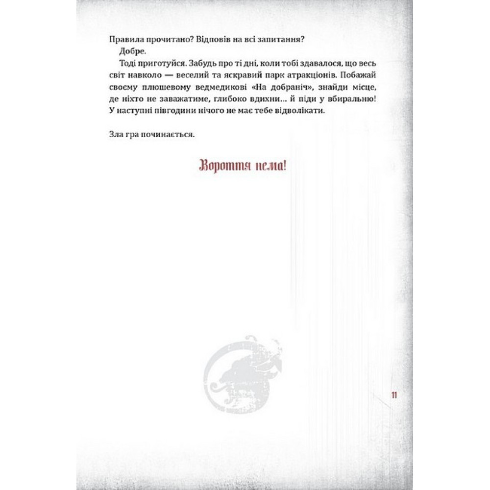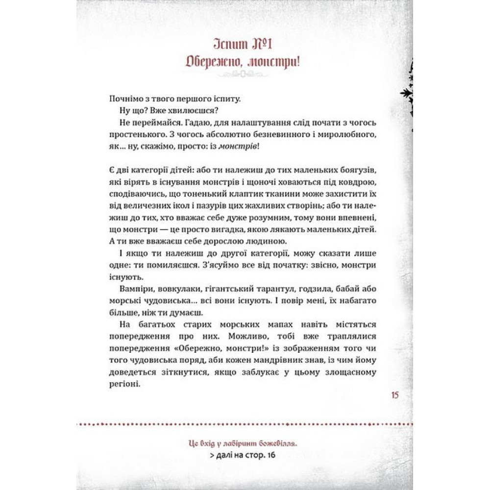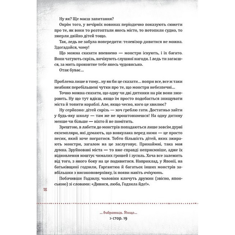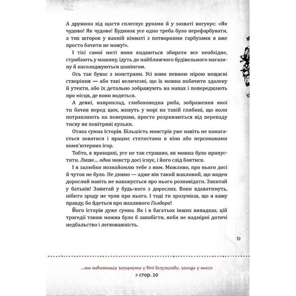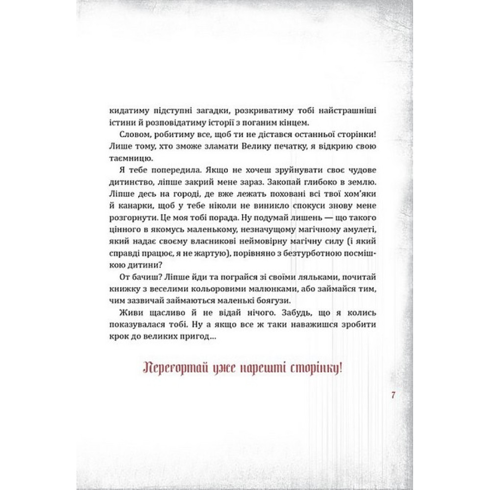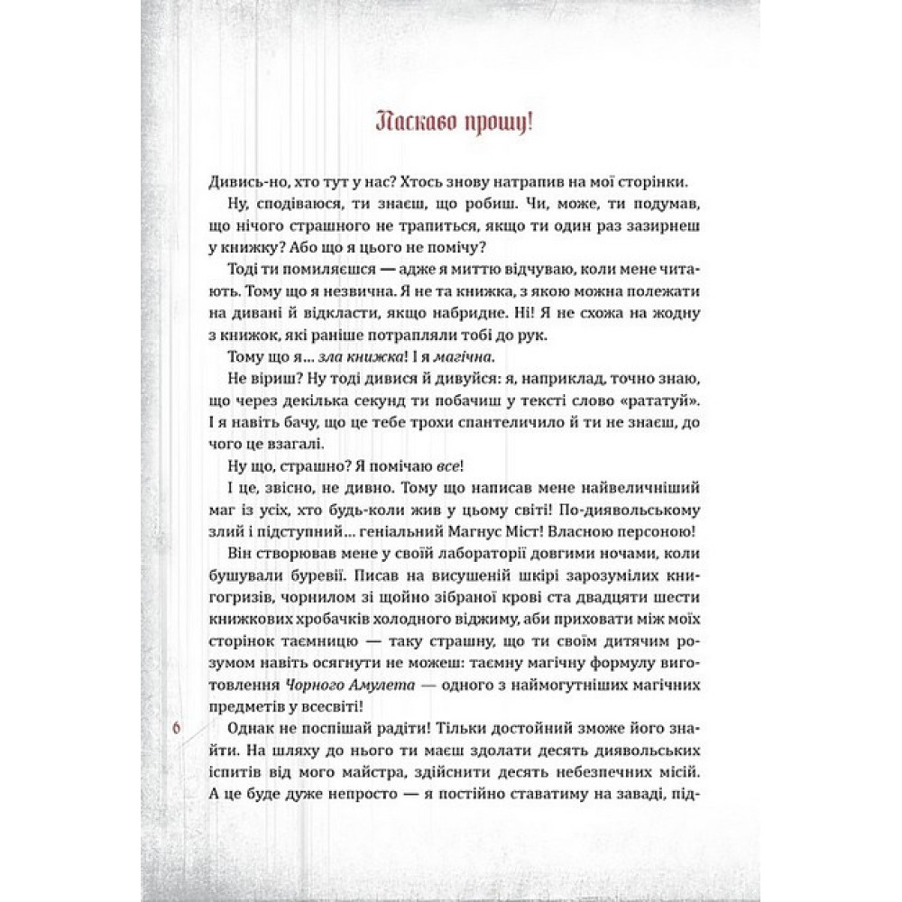 На жаль, сталася страшна помилка. Ця книжка ніколи не мала бути надрукована. Зараз видавництво вивчає всі обставини того, як таке сталося. У книжці містяться магічні формули та слова, яких ніхто не має чути! Тут наведено лише зухвалу брехню й загадки, які спантеличують навіть дорослих. А на початку ще й копошаться монстри!Рада тут одна: роздерти книжку на шматки; втопити в океані; або віддати сусідові, якого не любиш. Та в жодному разі не розгортати цієї книжки! Ця книжка дуже зла, а кожна її сторінка… може стати останньою у твоєму житті!
