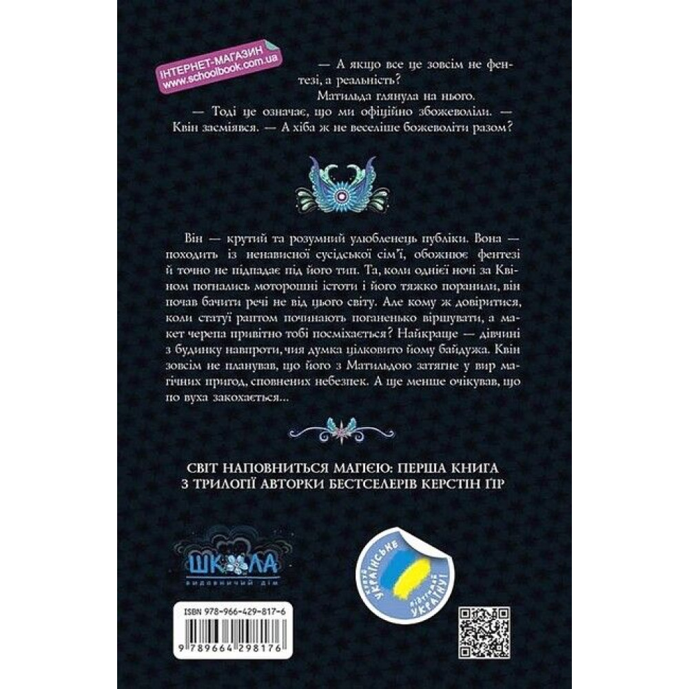 Дивовижні речі раптово зближують крутого улюбленця публіки і дівчину-сусідку, що обожнює фентезі й точно не підпадає під його тип. Коли однієї ночі за Квіном погнались моторошні істоти і його тяжко поранили, він почав бачити речі не від цього світу. Але кому ж довіритися, коли статуї раптом починають віршувати, а макет черепа привітно тобі посміхається? Найкраще — дівчині з будинку навпроти, чия думка цілковито йому байдужа. Квін зовсім не планував, що його з Матильдою затягне у вир магічних пригод, сповнених небезпек. А ще менше очікував, що по вуха закохається... Про авторку: За останні 5-7 років популярність сучасної німецької письменниці так зросла, що сьогодні купити книги Керстін Гір можна практично в будь-якому куточку планети. Читацьку любов і світову славу автору принесла трилогія «Таймлесс» про подорожі в часі. Однак написаного нею значно більше, просто ранні роботи не мали такого успіху, та й видавалися в основному під псевдонімом Джулі Бренд або Софі Берарді. Всіх книг Керстін Гір вже більше тридцяти. Останньою на сьогодні стала трилогія «Зільбер. Щоденники сновидінь», третя частина якої вийшла в 2016 році.