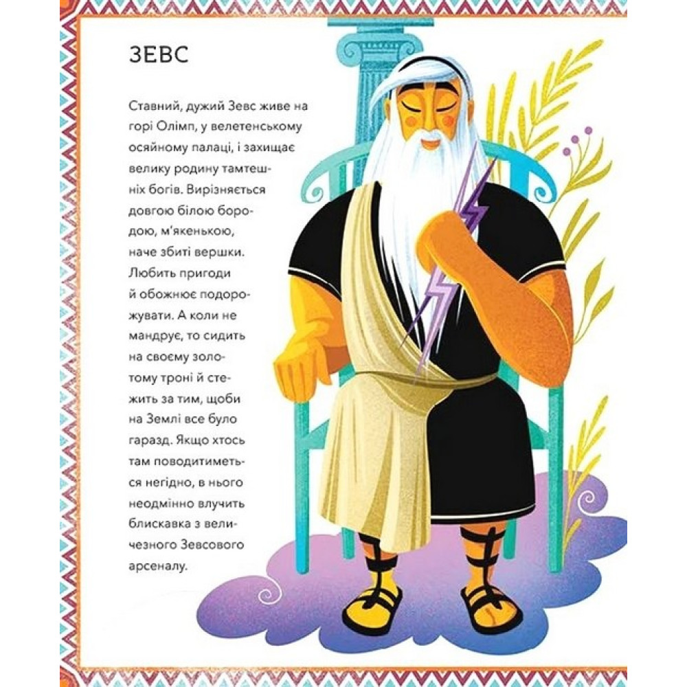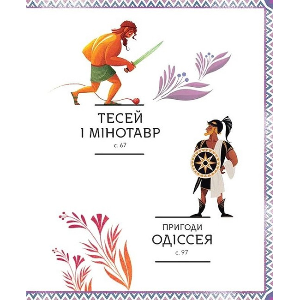 Поринь у світ чарівних міфів і познайомся з героями й богами! Хтось із них неймовірно сильний, хтось мудрий, хтось могутній, та кожен — незабутній!Зевс - володар Олімпу…5 Малий Зевс………....8 Зевсова родина……10 Зевс і Гермес………14 Божественні наради…16 Зевсова зброя…….....18 Вітайте володаря!.......20 Зевс проти Титанів…...22 Зевс проти Тифона…..26 Зевс і Прометей………30 Девкалліон і Пірра……32 Здібності Зевса………..34 Подвиги Геракла……………37 Геракл та змії………….40 Озброєння……………42 Подвиги………………….44 Немейський лев…….…..44 Лернейська гідра……...48 Керинейська лань……..52 Стімфалійські птахи…...56 Пасок Іпполіти…………58 Золоті яблука Гесперид..62 Тесей і мінотавр………..………67 Корабель з Афін…………70 Мінотавр………………….72 Лабіринт…………………74 На Криті…………………76 Нитка Аріадни……………78 Тесей у лабіринті…………82 Зустріч із Мінотавром……86 Битва………………………88 Геть із лабіринту…………92 Свято перемоги…………94 Пригоди Одіссея………………97 Троянський кінь…………100 Покривало Пенелопи……104 Поліфем……………………106 Чародійка Цирцея………112 Сирени……………………116 Сцілла і Харбіда…………120 Повернення до Ітаки івірний пес Аргос...122 Змагання лучників………124