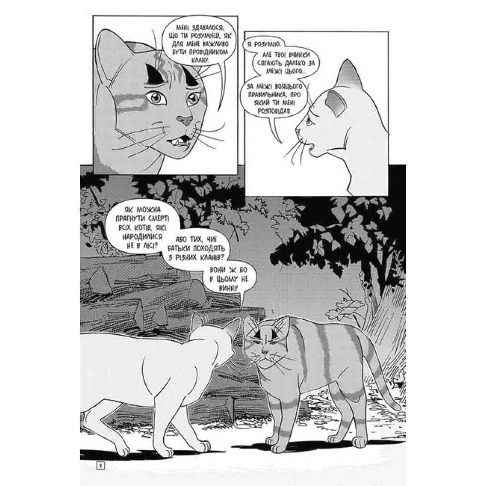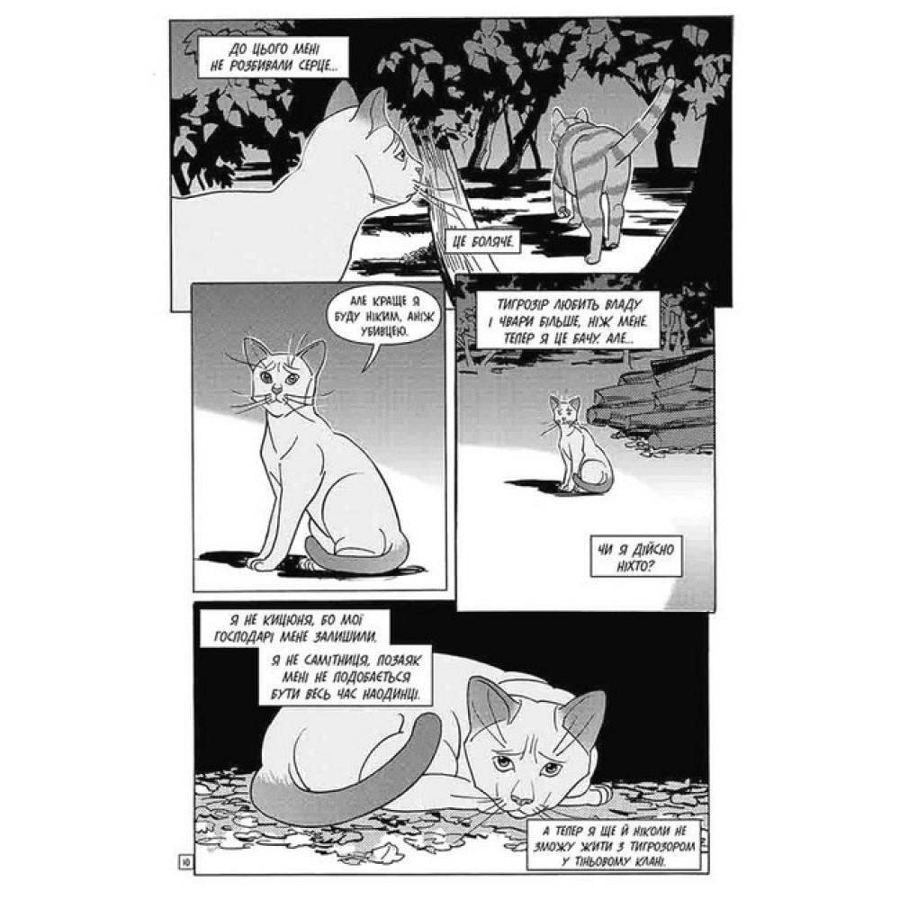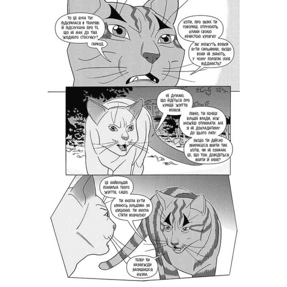 Світовий бестселер від Ерін Гантер — тепер у манґах! Саша мала все, про що може мріяти кицюня: гарні господарі, які піклувалися про неї вдень, і вільні ночі, коли можна досхочу вивчати навколишні території. Але щасливим дням настав край, отож Саша змушена залишити домівку й оселитися в лісі. Зустрівшись із Тигрозіром, вона закохується й починає думати, що найкращим для неї буде пристати до вояків. Але в Тигрозора забагато таємниць, запальна вдача і не дуже зрозумілі наміри. Яке його справжнє обличчя? І чи можна йому довірити своє життя? Чому варто читати: Серія пригодницьких романів-фентезі, які читають підлітки та їх батьки. Книги серії мають поціновувачів в Англії, США, Німеччині, Франції, Іспанії, Італії, Польщі, Чехії, Японії, Китаї… — понад 30 000 000 читачів й фанів у всьому світі! Автор: Серія «Коти-вояки» створена британськими письменницями Кейт Кері, Черіт Болдрі, Тай Сазерленд у співавторстві з редактором Вікторією Голмс під загальним псевдонімом Ерін Гантер.