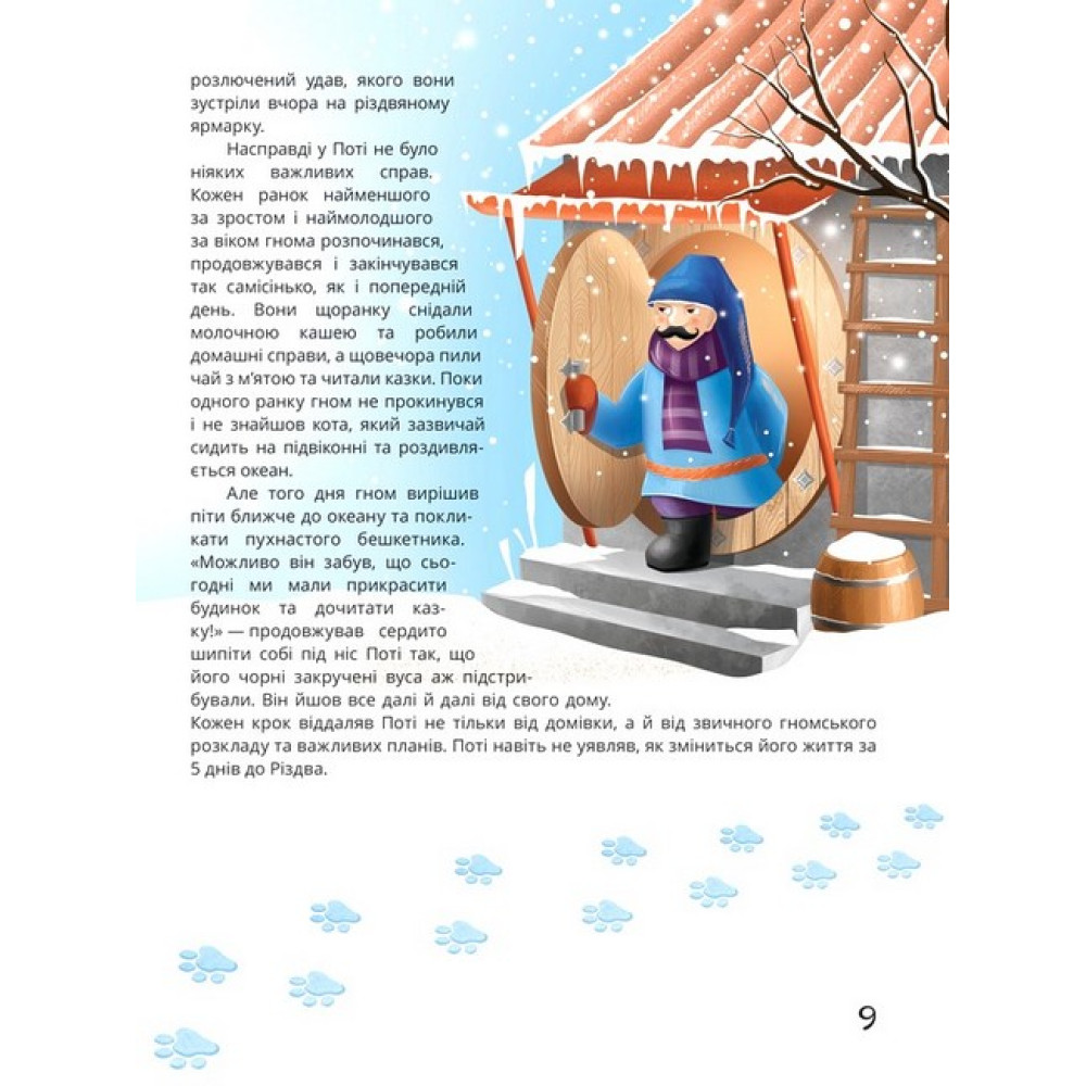 У час Різдва всім хочеться вірити в чудеса — дорослим, і дітям. Ця книга про дивну пригоду гнома Поті і його котика Бруно, який раптом загубився у передріздвяні дні. Поті та Бруно живуть у своєму затишному будиночку на березі океану. Аж раптом за п’ять днів до Різдва котик Бруно зникає безслідно. Поті змушений залишити свій безпечний дім і вирушити на пошуки свого друга. На гнома Поті чекають нові дивовижні знайомства з Ельфом, Гобліном, Ведмедицею, Сантою, він стійко долає небезпечні випробування, на нього чатують дивні відкриття, які змінять його життя і ставлення до світу назавжди. Ця різдвяна історія — про вірну дружбу і чудеса, які трапляються, якщо в них вірити.