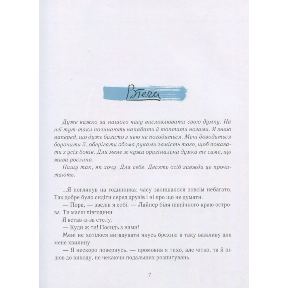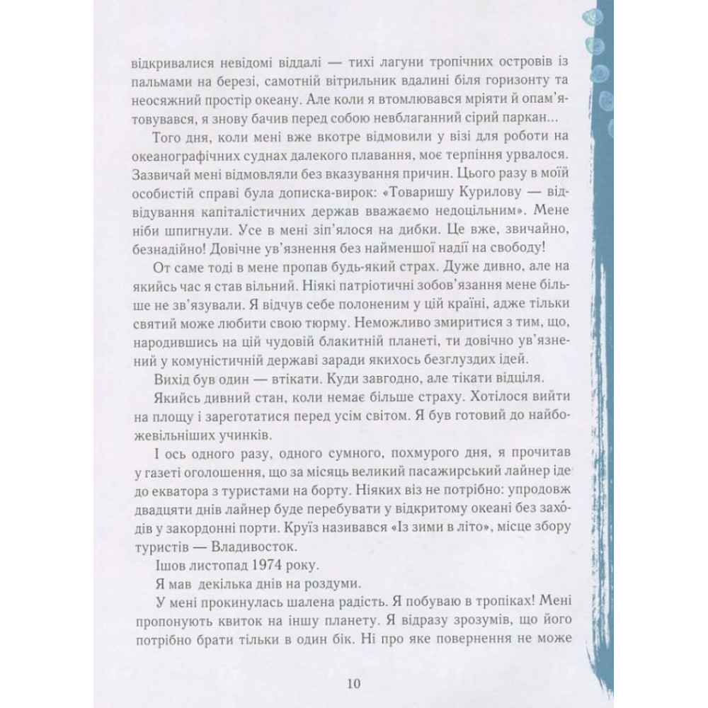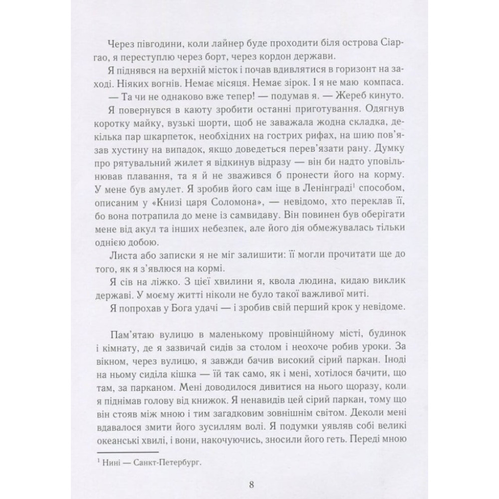 Відзнака в одній з категорій премії "Краща книга України" 2019 року.Автобіографічна повість.Цю історію часто називають одним з найяскравіших і небезпечних пригод XX століття. Без їжі й пиття, без морського спорядження, оснащений лише маскою, ластами й трубкою, Слава Курилов проплив до філіппінського берега близько ста кілометрів, провівши в океані майже три доби.Ідея, що обрамлюється у мрію і горить всередині кожного з нас, спонукає перевершувати світ і доводити, що немає нічого неможливого, якщо вона, ідея, палає!Ця історія — про силу людської мрії, яка знищила страх і сумніви. Вона допоможе тобі знайти в собі силу і здійснити власну мрію.Сам в океані