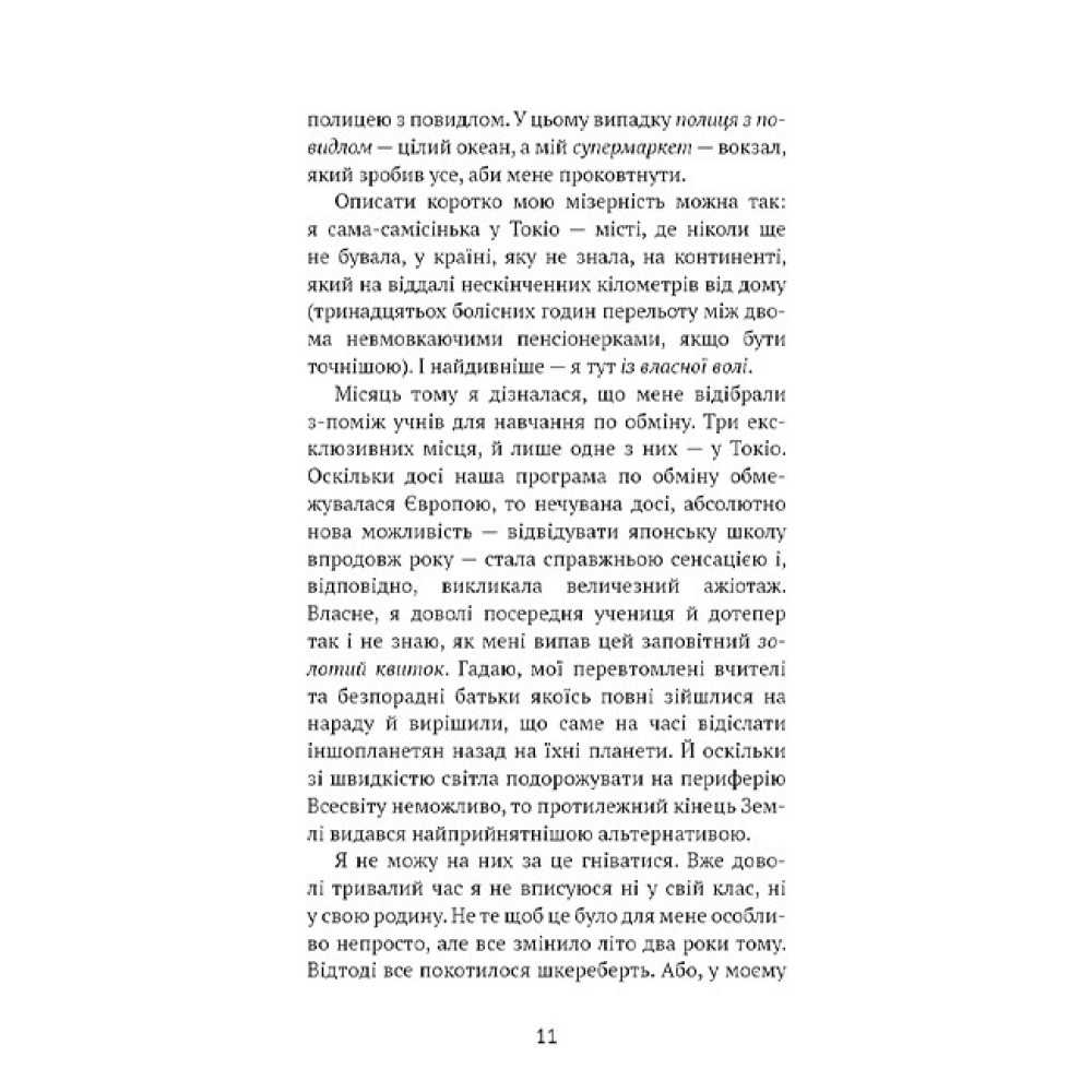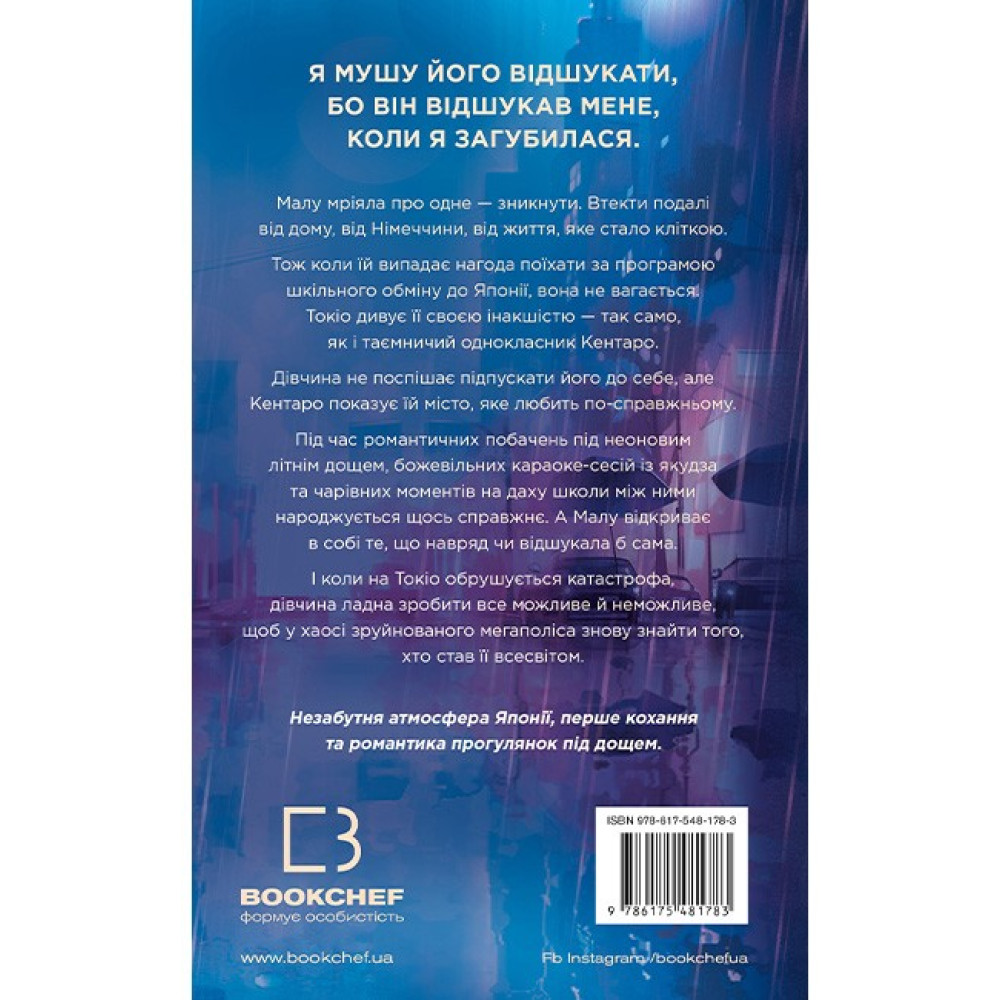 Малу мріяла про одне — зникнути. Втекти подалі від дому, від Німеччини, від життя, яке стало кліткою. Тож коли їй випадає нагода поїхати за програмою шкільного обміну до Японії, вона не вагається. Токіо дивує її своєю інакшістю — так само, як і таємничий однокласник Кентаро. Дівчина не поспішає підпускати його до себе, але Кентаро показує їй місто, яке любить по-справжньому. Під час романтичних побачень під неоновим літнім дощем, божевільних караоке-сесій із якудза та чарівних моментів на даху школи між ними народжується щось справжнє. А Малу відкриває в собі те, що навряд чи відшукала б сама. І коли над Токіо обрушується катастрофа, дівчина ладна зробити все можливе й неможливе, щоб у хаосі зруйнованого мегаполіса знову знайти того, хто став її всесвітом.